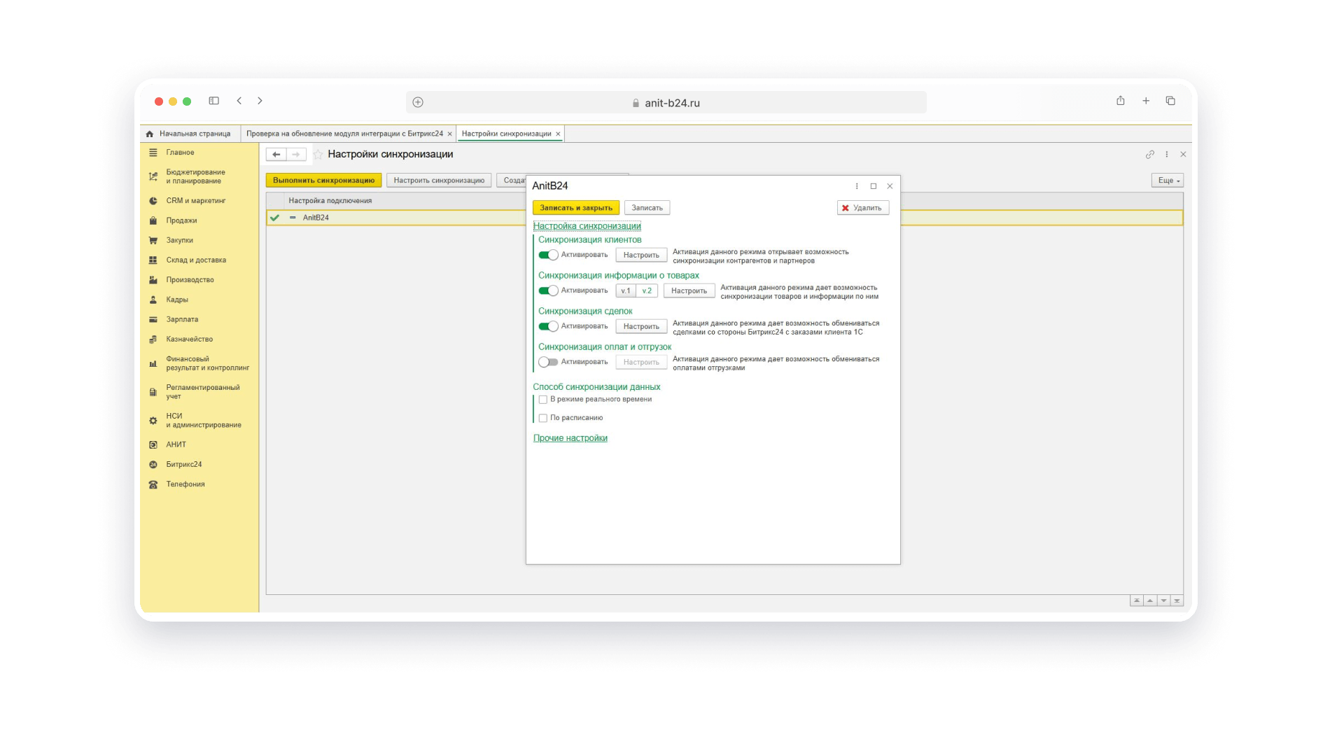 В другом проекте клиенту потребовалась не только стандартная передача заказов, но и обмен печатными формами, структурой справочников и цепочкой счетов. Мы внедрили новую версию модуля обмена, синхронизировали компании, сделки, товары, валюты, склады, типы цен. Внимание уделили соответствию версий обеих систем и сопоставлению полей. После запуска обмен стал работать в обе стороны, а у сотрудников всегда была актуальная информация по остаткам и оплатам.