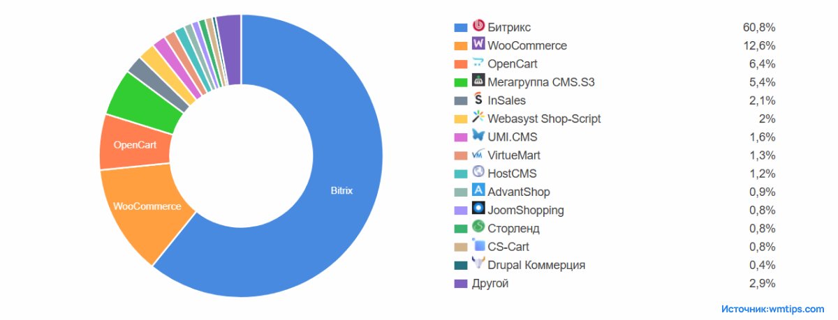 Среди движков интернет-магазинов по сайтам из РФ1С-Битриксудерживаетлидерство с ~60,8% доли(12 мес., обновлено 28.08.2025). Далее — WooCommerce (12,6%), OpenCart (6,4%).