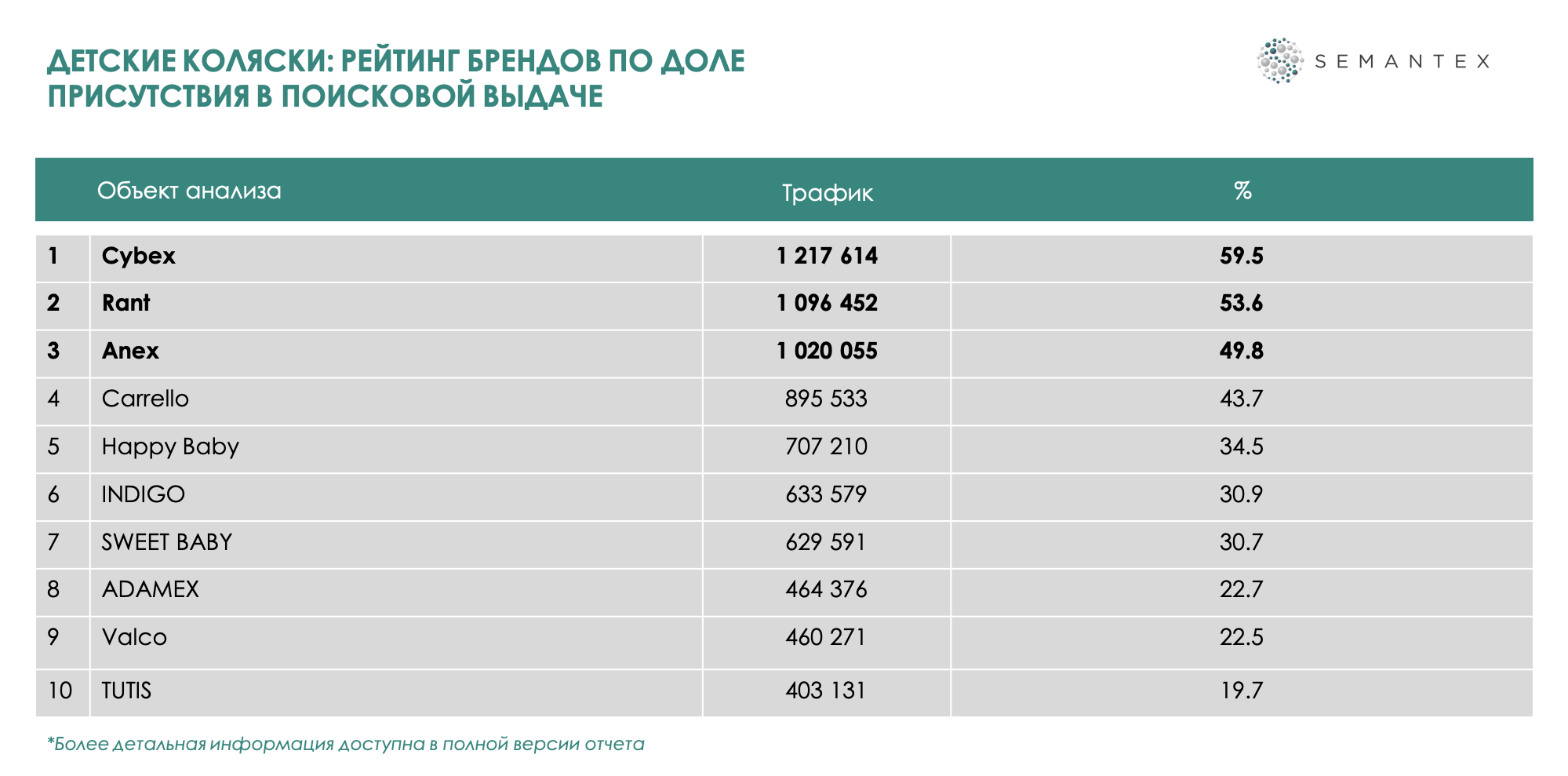 В Semantex мы провели детальный анализ поискового ландшафта, чтобы выяснить: как восприятие брендов в цифровой среде влияет на реальные продажи, какие пользовательские сигналы становятся решающими, и кто из игроков рынка незаслуженно упускает лидерство, проигрывая в топе выдачи. В фокусе исследования — репутация брендов детских колясок в поисковой выдаче.