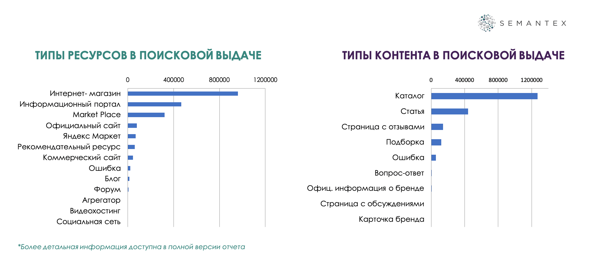 Отметим, что в выдаче пользователи в основном видят интернет-магазины, информационные порталы и маркетплейсы. Самый популярный (с т.з. приходящего трафика) тип контента – каталог, статья, страница с отзывами.