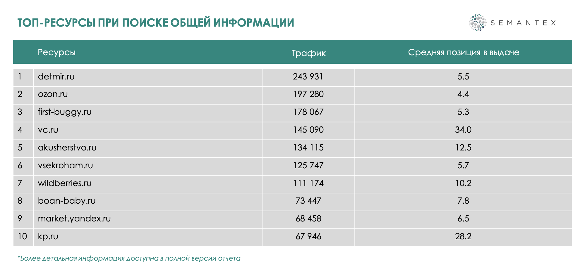 Теперь разберемся, на какие ресурсы при поиске информации о детских колясках чаще заходят пользователи. Рейтинг (см. далее) выстроен по убыванию трафика, приходящего на указанные площадки по заданному семантическому ядру.