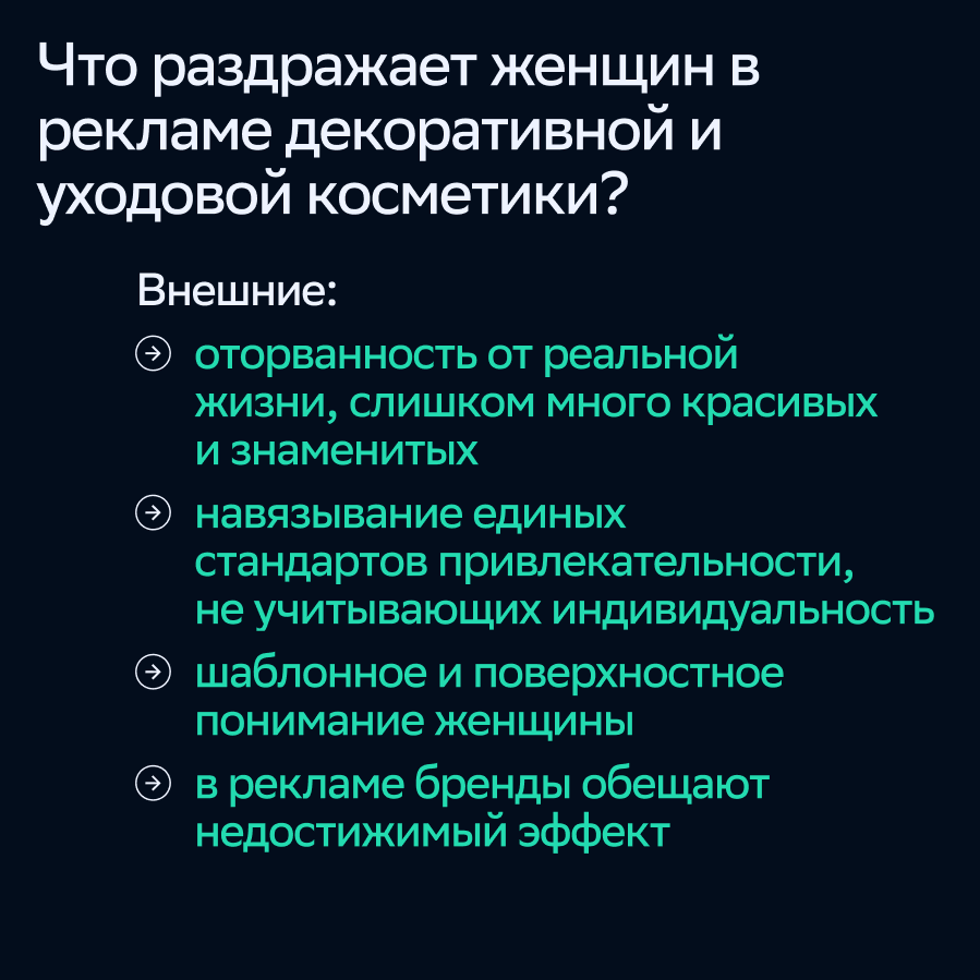 В рекламе декоративной косметики женщин больше всего раздражает оторванность от реальной жизни (слишком много красивых и знаменитых), давление некоторого стандарта красоты и шаблонное, поверхностное понимание женщины, а в рекламе уходовой косметике — то, что бренды обещают недостижимый эффект.