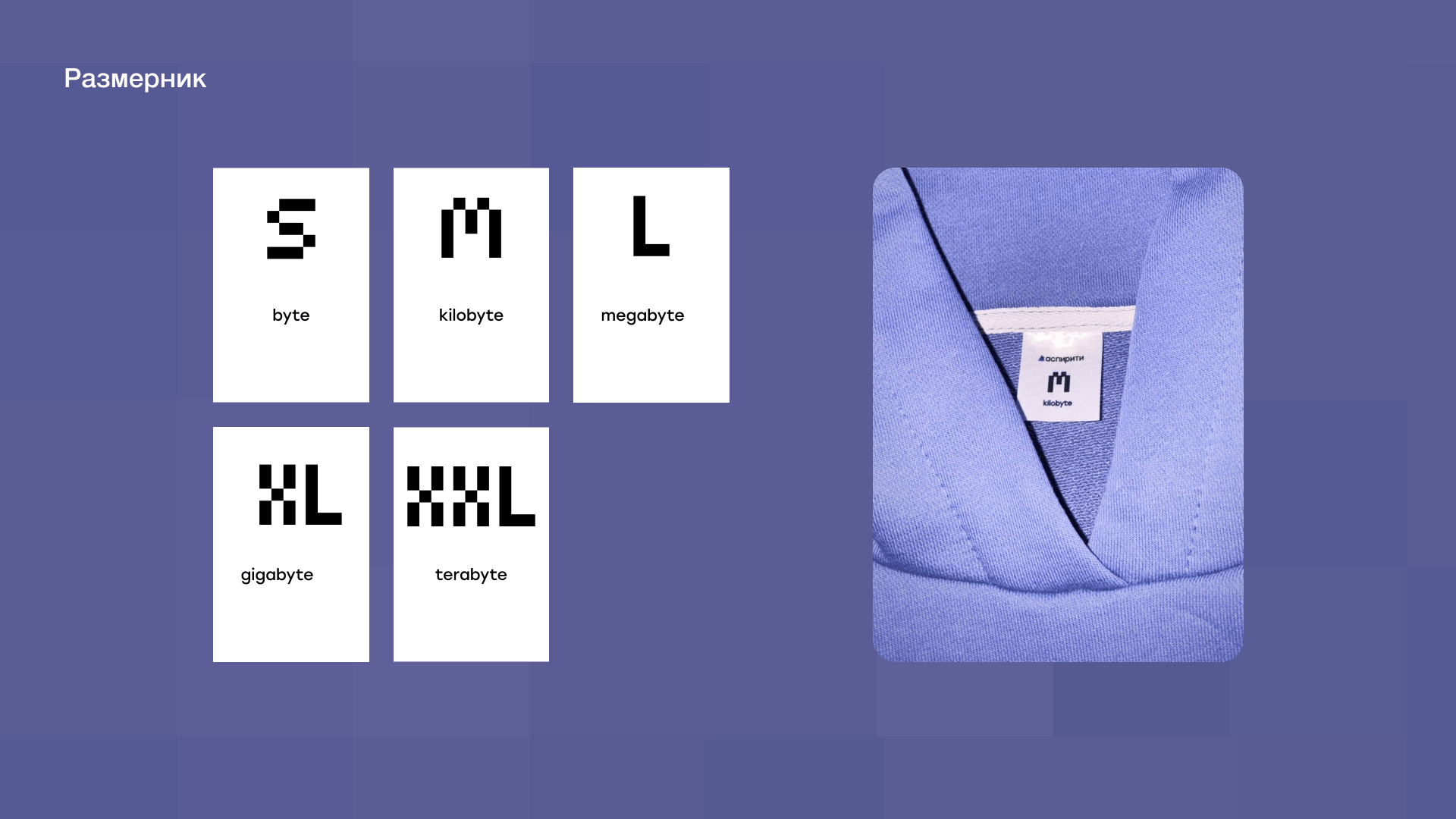 Большинство компаний, которые заказываю мерч, просто добавляет свой логотип, а мы прописали даже свои названия для привычных размеров. Тоже в пиксельном стиле.