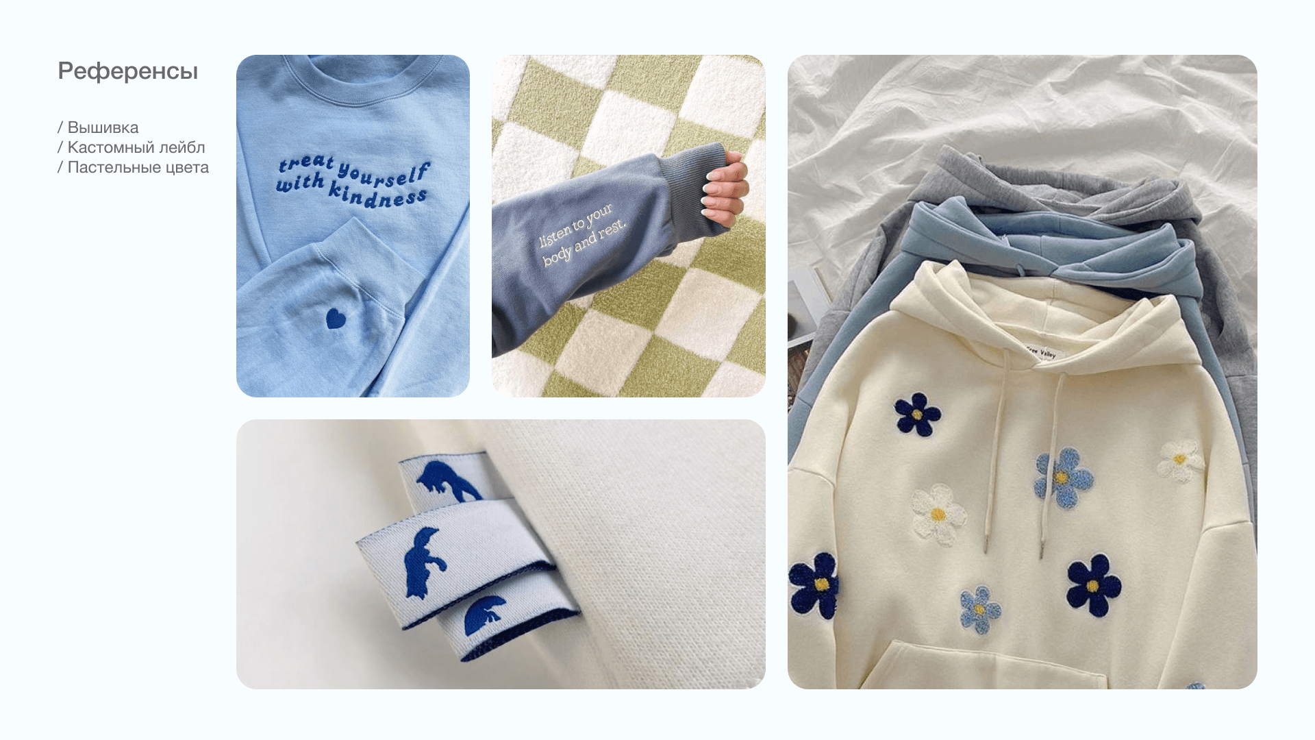В итоговой концепции я предложила сделать акцент на вышивку, а для худи выбрать спокойные цвета, которые будут сочетаться со всем в гардеробе. И пришла к Марии с презентацией, готовая защищать всё. Но защищать ничего не пришлось, потому что Маше цвета тоже понравились.