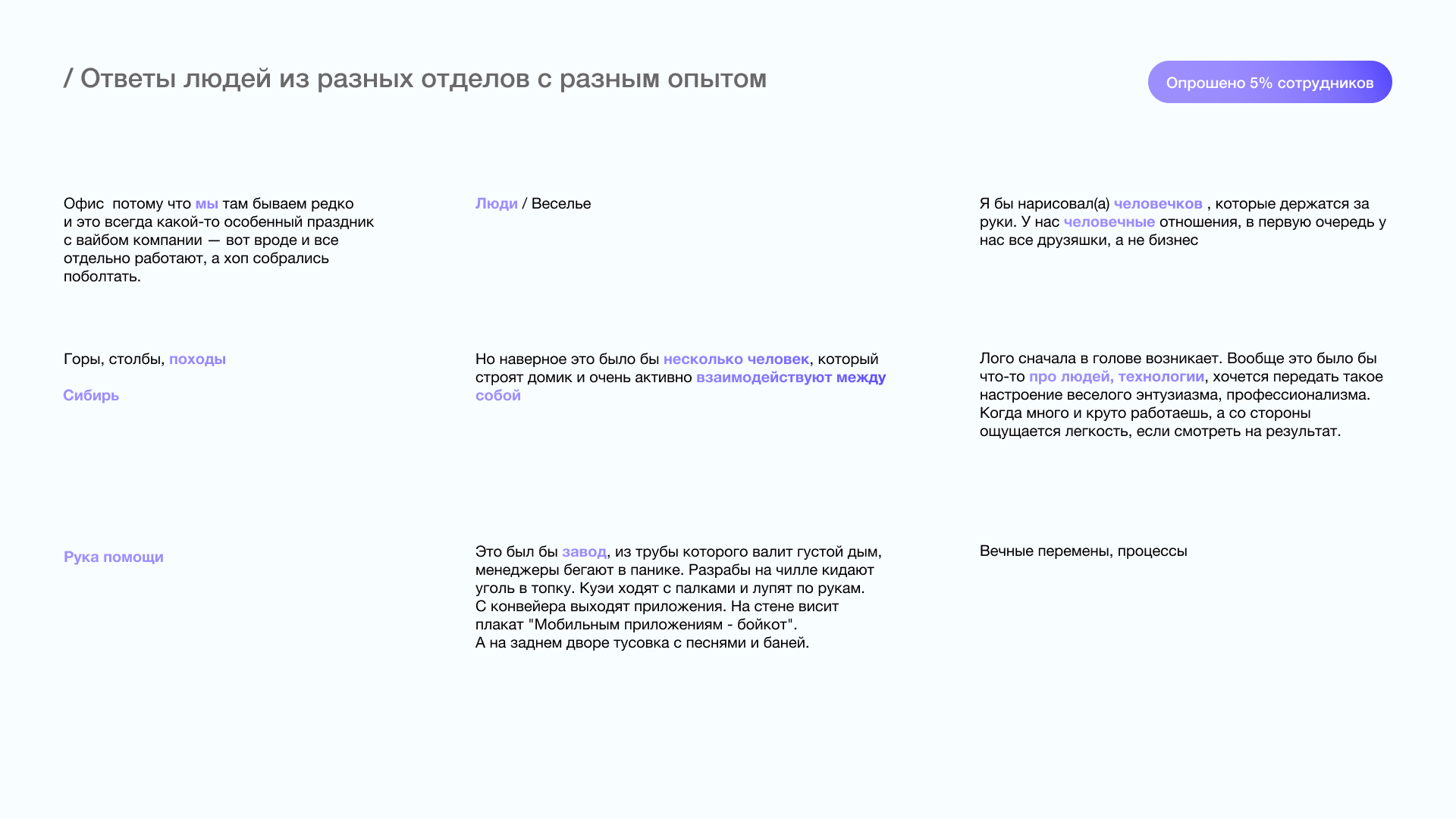 Мне не хотелось ставить рамки или наталкивать на «верный ответ». Поэтому разграничение было только по отделам, так что коллеги ответили очень развёрнуто и эмоционально.
