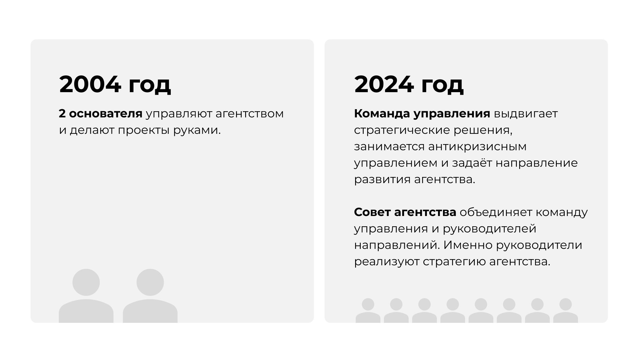Несмотря на выход основателей из операционки, мы выросли и по количеству людей, и по объёмам годовой выручки. В 2024 году в агентстве работает больше 150 человек, и мы хотим в 5 раз вырасти по выручке к 2030 году по сравнению с 2020 годом.