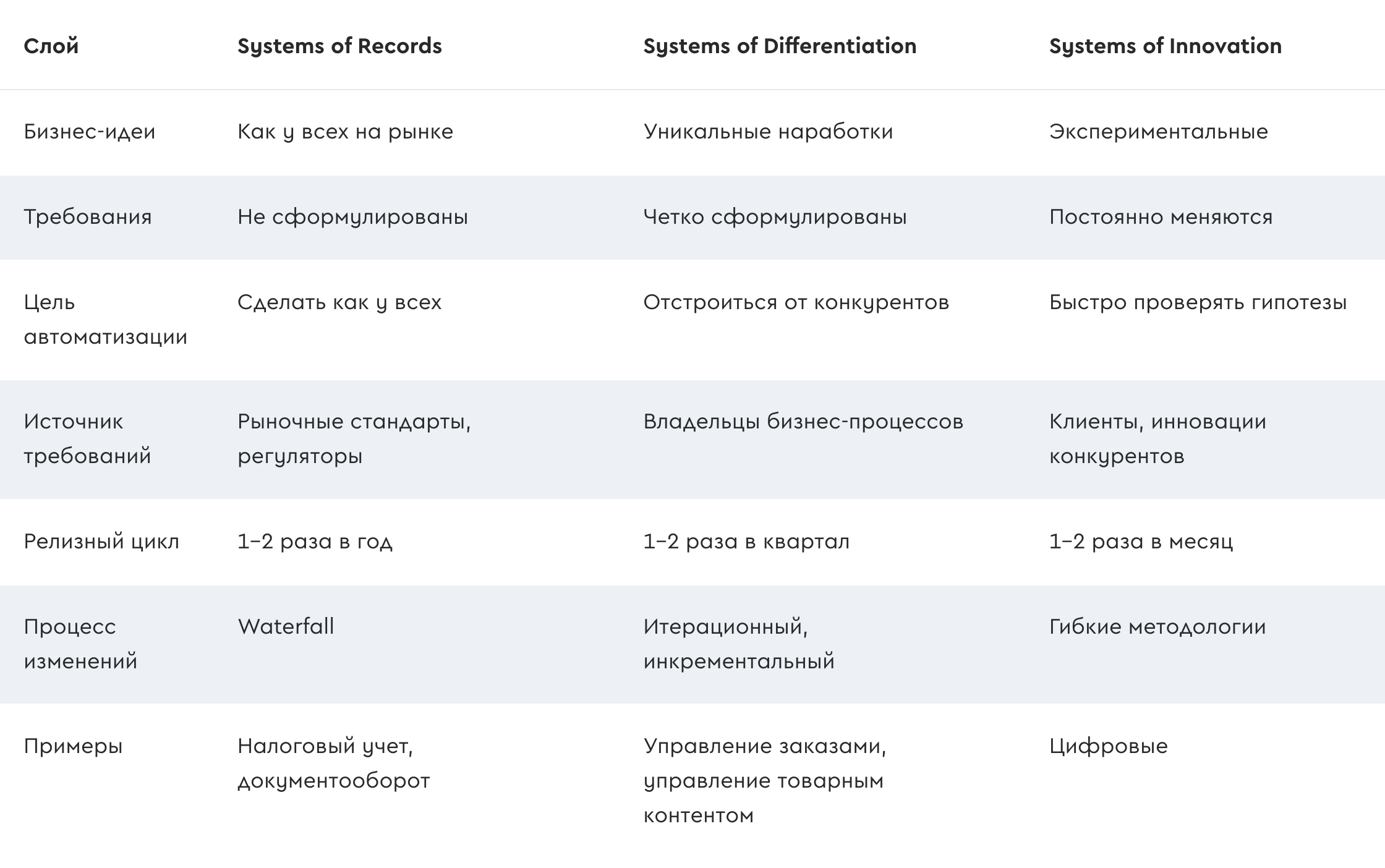 В таблице (по мотивам аналогичных таблиц Gartner) показаны отличия в развитии систем каждого из слоев. Для разных приложении требуется разный релизный цикл: от ежедневных изменении через, скажем, двухнедельные спринты до отгрузок раз в несколько месяцев.