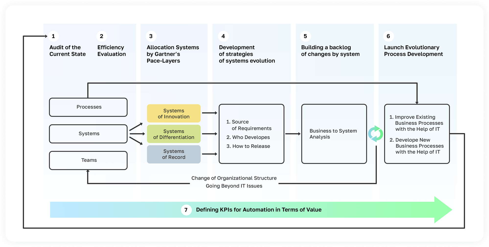 Это циклический процесс, который выходит за пределы полномочии IT-подразделении, потому что существенно влияет на структуру продуктовых команд, а значит и на общую оргструктуру компании.