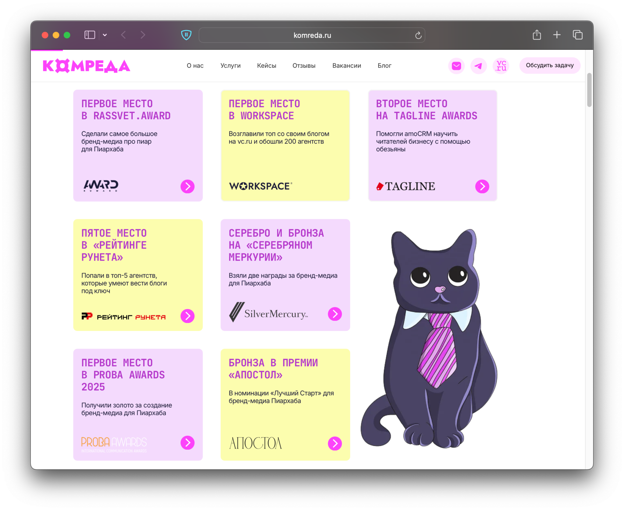 ➜ Работа без компромиссов. Любая работа, которая не соответствует высоким стандартам, возвращается на доработку. Мы любим задачи, где нужно не просто сделать хорошо, а обогнать всех конкурентов. Замеряем ключевые метрики конкурентов и разрабатываем план, как по этим показателям стать лучшими в нише. Именно поэтому наши проекты регулярно получают отраслевые награды: например, за самое большое медиа о пиаре для «Пиархаба» — первое место Rassvet Award и золото Proba Awards 2025. Блог КОМРЕДЫ на vc.ru обошёл более 200 участников рейтинга и получил первое место Workspace. И это далеко не всё: