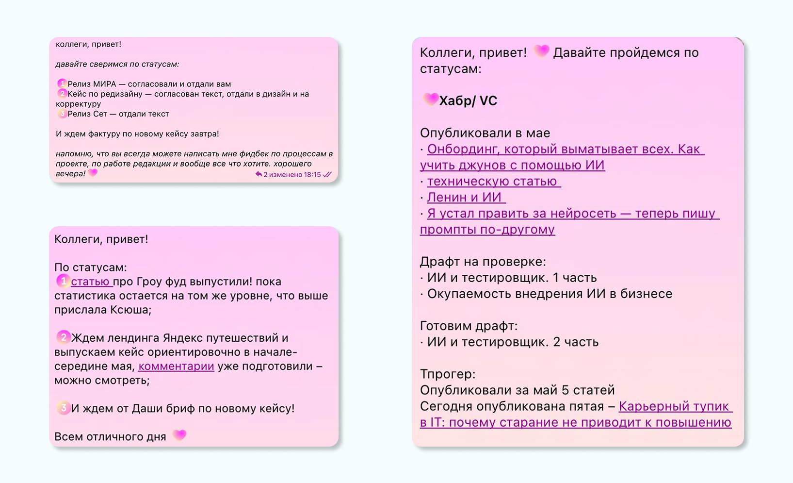 Такая иерархия нужна не всегда: если речь о разовом тексте, один человек может закрыть задачу. Но если нужно выпускать много материалов, например десять статей в месяц, без распределения ролей качество и сроки быстро просядут, поэтому тут мы привлекаем полную команду. В итоге статьи получаются интересными, поисково‐оптимизированными и решающими задачи клиента.