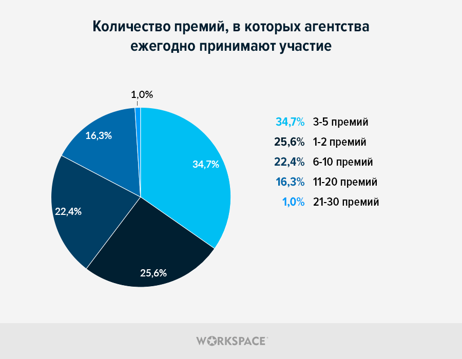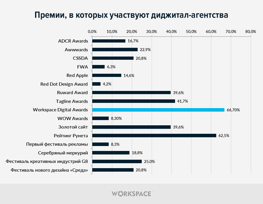 Итак, какие конкурсы наиболее популярны среди диджитал-агентств? Лидером списка стал Workspace Digital Awards. Следом идут «Рейтинг Рунета», Tagline Awards, «Золотой сайт». Эти премии, кроме первой в списке, существуют уже более десяти лет и зарекомендовали себя в профессиональной среде. Что касается Workspace Digital Awards, хоть она и проводится всего в третий раз, ее востребованность во многом определяется предыдущим вкладом создателей в ряд важных отраслевых проектов.
