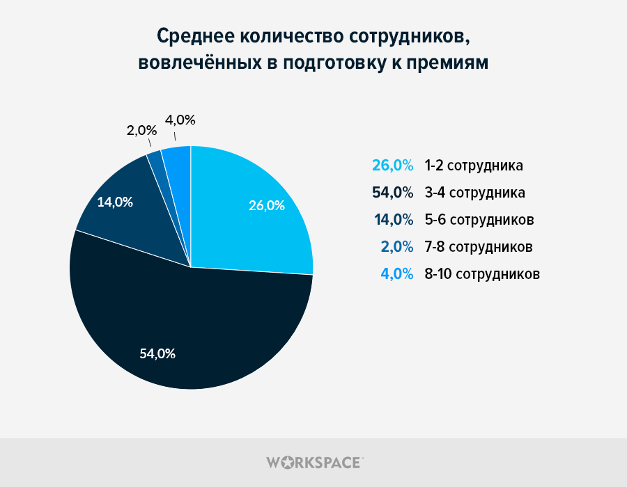 Похожая ситуация и с количеством сотрудников, вовлеченных в процесс подготовки конкурсных кейсов. Похоже, что для повышения шансов на победу, не имеет значения, работает ли над кейсом 3 сотрудник или 8. Однако, все же компании, которые указывали вариант