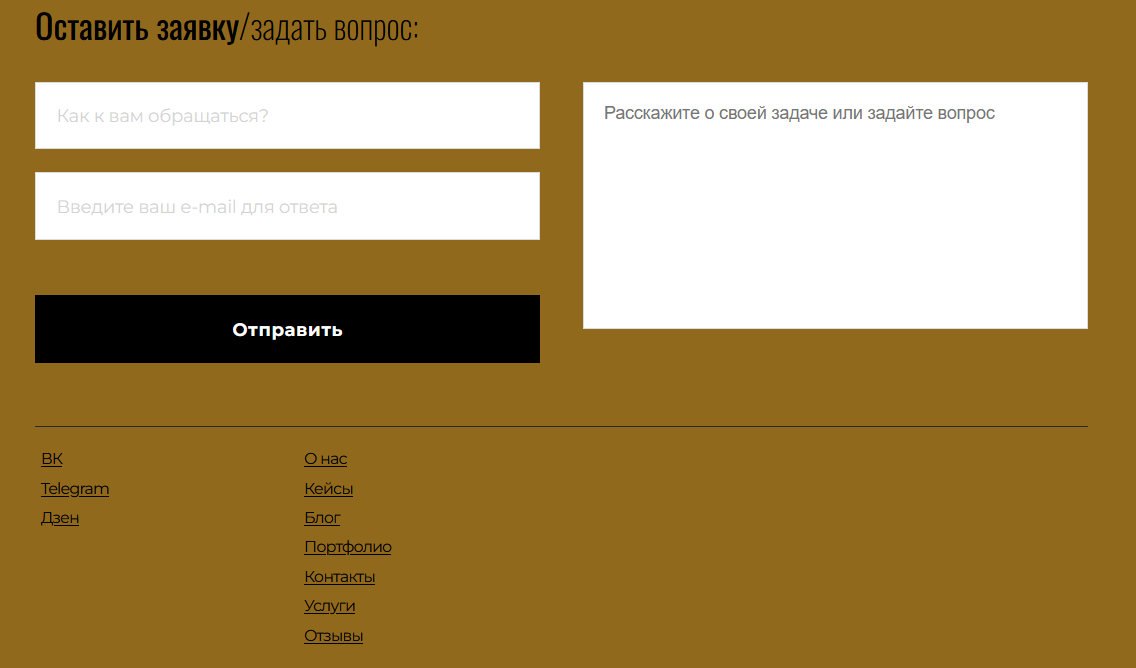 Лид-форма — один из самых работающих инструментов. Ее цель — собрать контакты, с которыми потом можно работать: прогревать их, отправлять предложения, коммуницировать. У нас на сайте лид-форма висит в футере сайта: