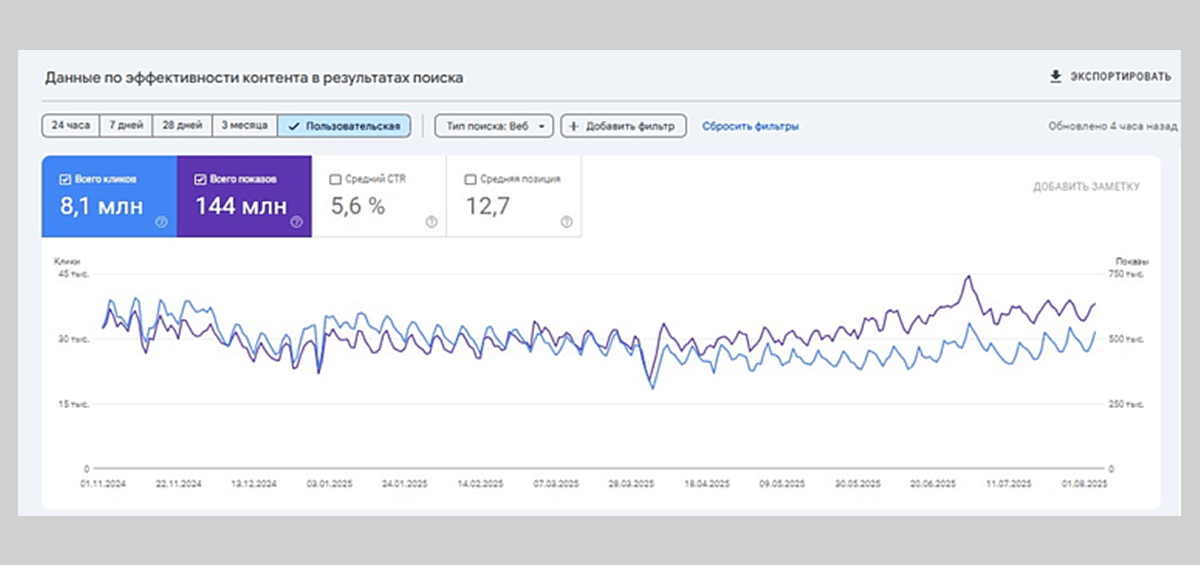 Для веб-мастеров и маркетологов это создает проблему прозрачности. Переходы из внешних AI-сервисов можно отследить через аналитику (utm-метки, рефереры). Однако клики, которые «съедаются» внутри поисковой выдачи, отследить невозможно. Мы видим лишь сухие цифры. Сайт ранжируется, но пользователь, получив ответ в блоке, закрывает вкладку, так и не совершив переход. Это создает слепую зону в аналитике, где реальное потребление контента происходит без участия сайта-источника.