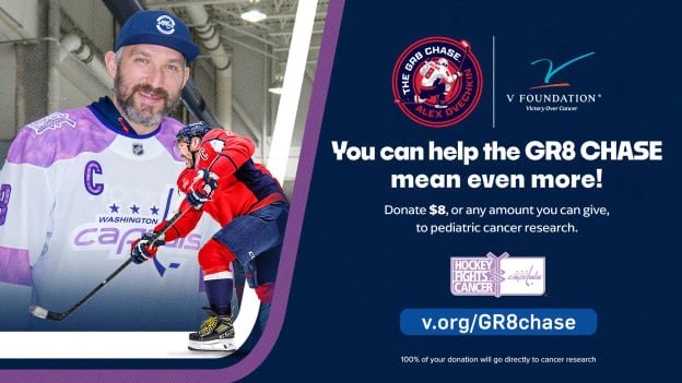В 2025 году Овечкин запускает акцию THE GR8 CHASE for Victory Over Cancer.За каждый гол он жертвует деньги на исследования детского рака — и привлекает к этому болельщиков, бизнес и партнеров.