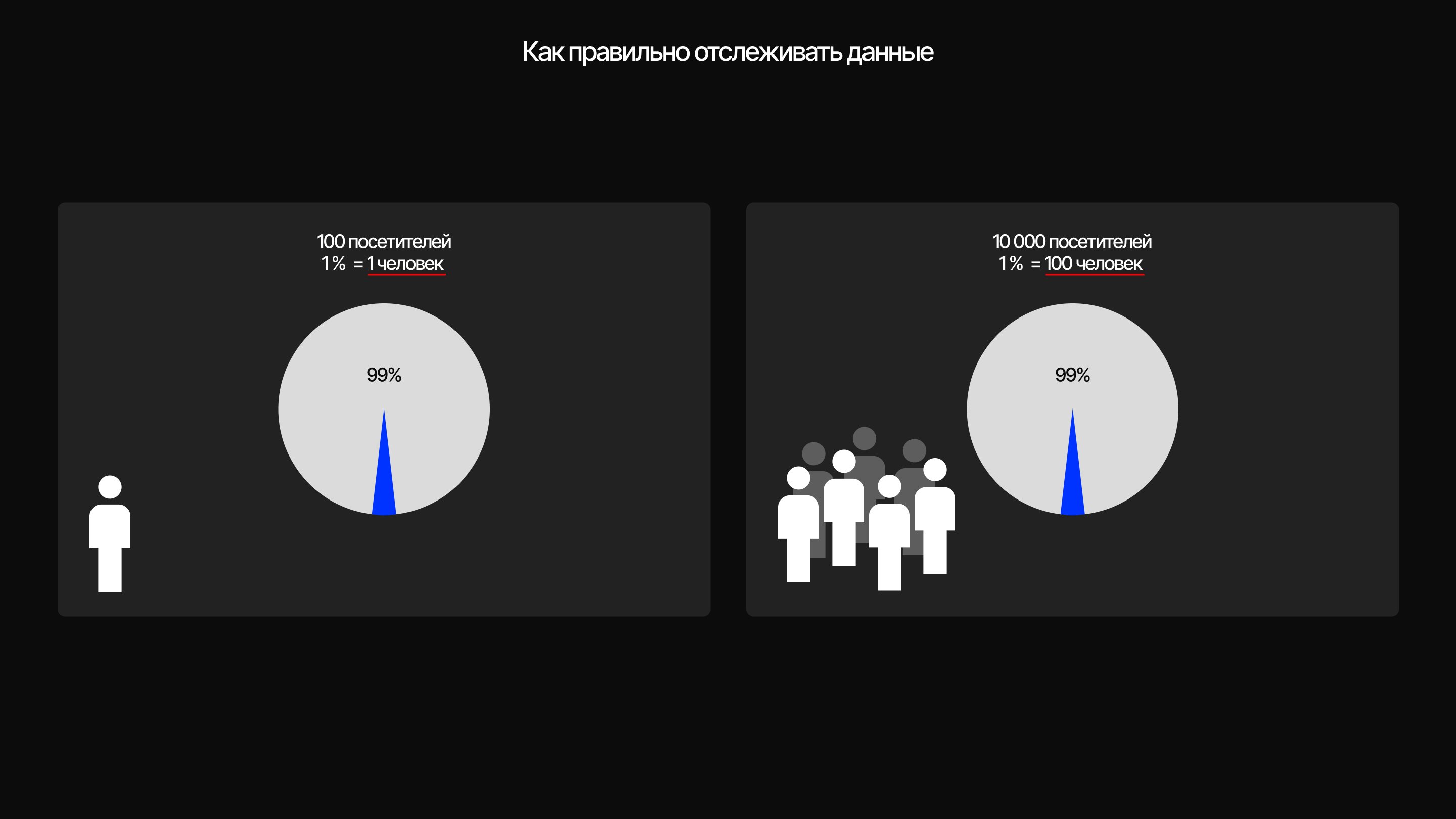 Очень важно, чтобы данные были репрезентативными. Для обоснованных выводов на сайте должно быть хотя бы от 1000 посетителей. Чем больше данных вы соберете, тем точнее сможете определить точки роста.