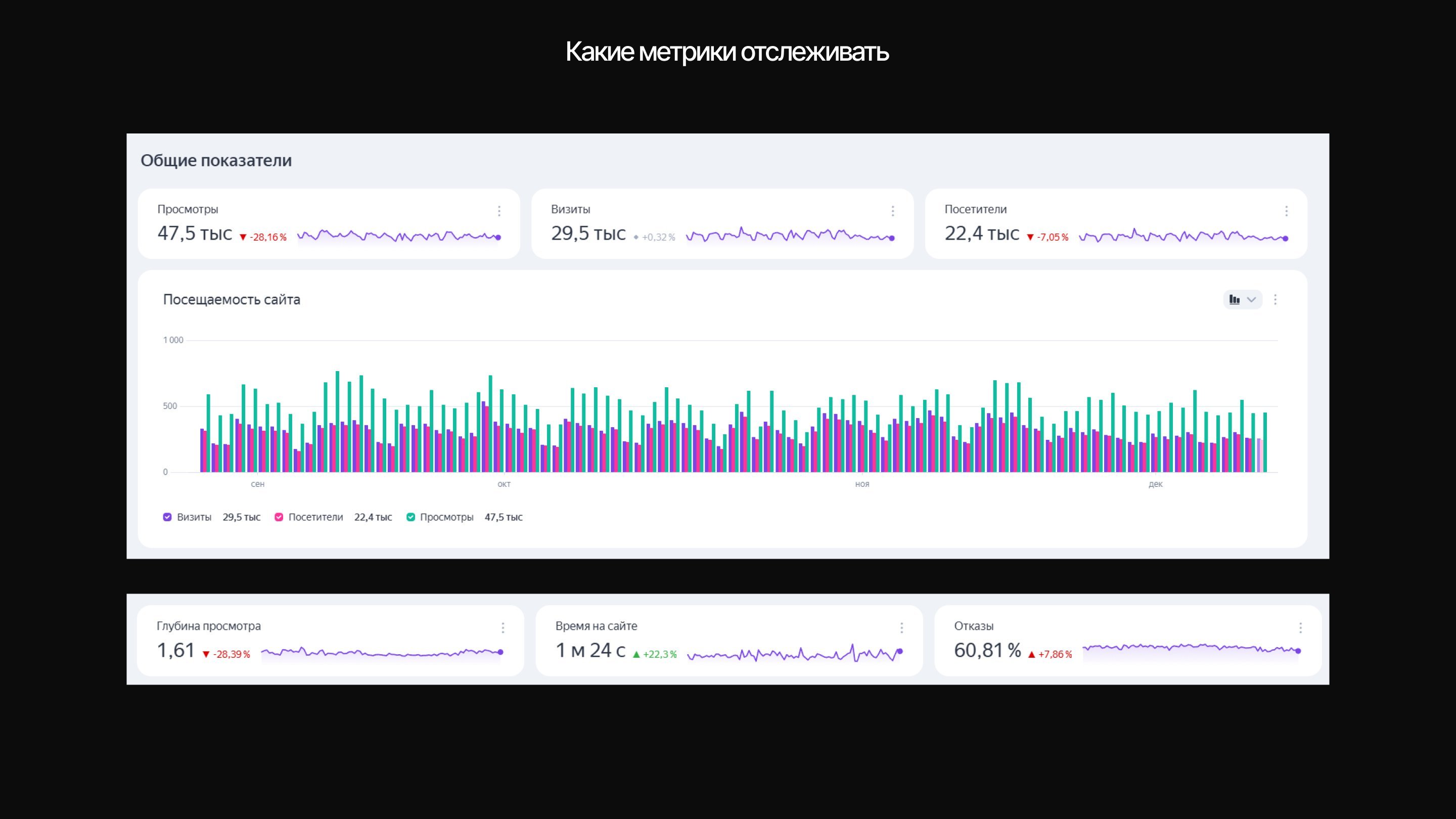 Что можно понять: приходит ли на сайт новый трафик и в каком количестве. Если бизнес сезонный, то в норме ли спад спроса или стоит бить тревогу.