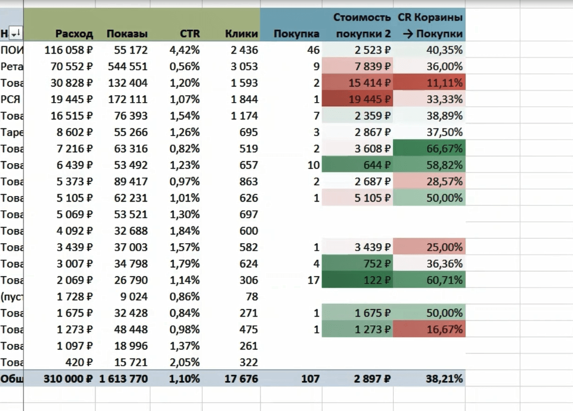 Обратите внимание, что по строчкам у нас идёт список рекламных кампаний. Я их сузил специально, чтобы не палить данные клиента. По столбцам есть рекламные метрики – это расходы, показы, клики, CTR и прочее. И есть данные по веб-аналитике: кол-во заказов, конверсия в покупку, стоимость целевого действия (покупки).