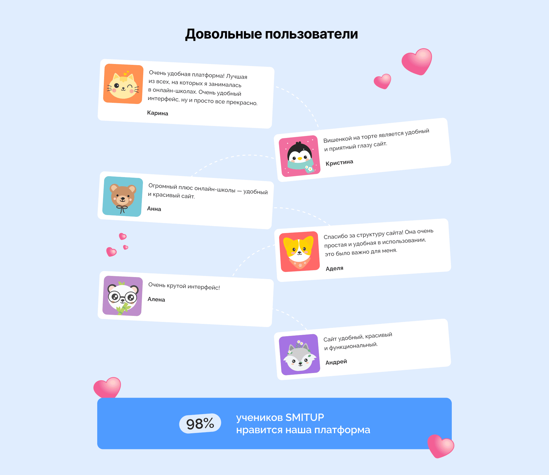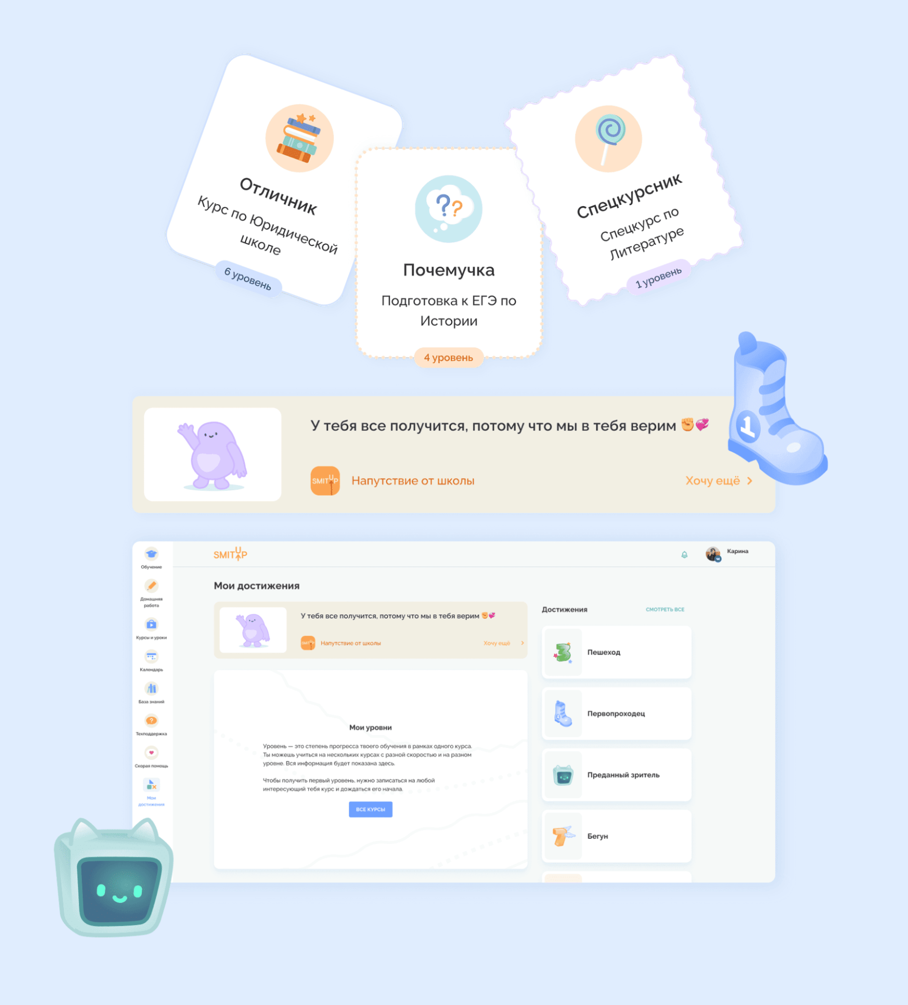 Дашборд с прогрессом, дедлайнами и достижениями снижает тревожность, помогает планировать время и мотивирует продолжать учиться. В СМИТАП уровень удовлетворенности интерфейсом стабильно держится выше 90% именно за счет прозрачности и скорости обратной связи.