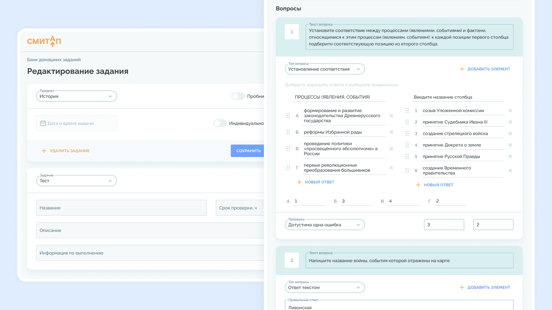 В СМИТАП редактор адаптирован под форматы ЕГЭ. Он учитывает незначительные ошибки, а тесты можно копировать и перемещать между курсами. Благодаря такому подходу изменения в одном элементе автоматически появляются во всех связанных уроках — это экономит недели работы на обновлениях.