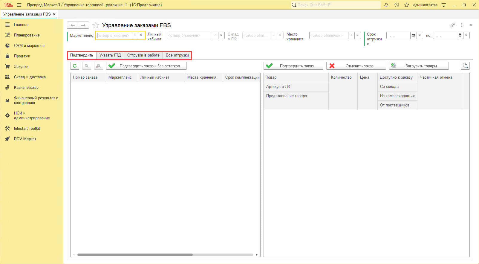 Интерфейс рабочего места "Управления заказами FBS" лаконичный и содержит только четыре ключевые вкладки: