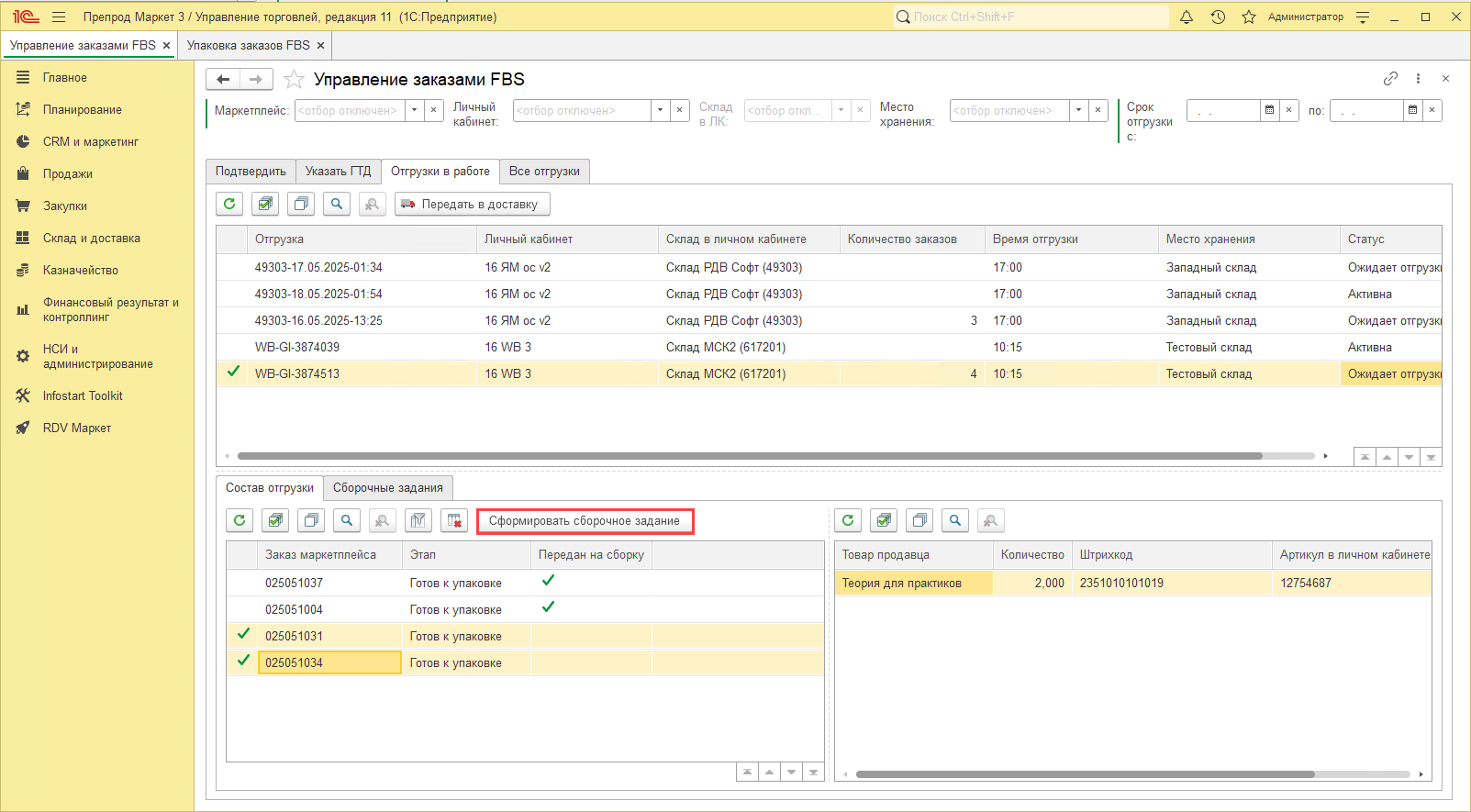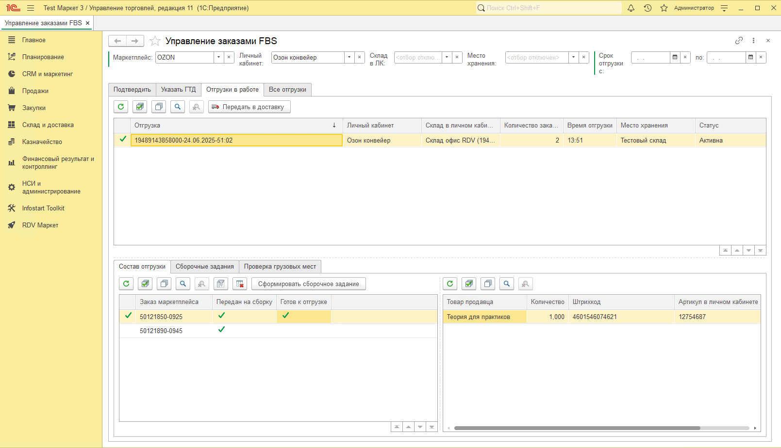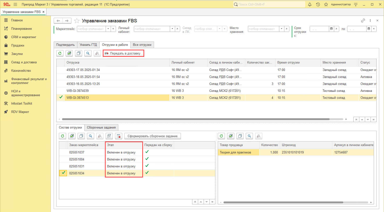 Для передачи в доставку в рабочем месте "Управление заказами FBS" найдите нужную отгрузку и нажмите кнопку "Передать в доставку"