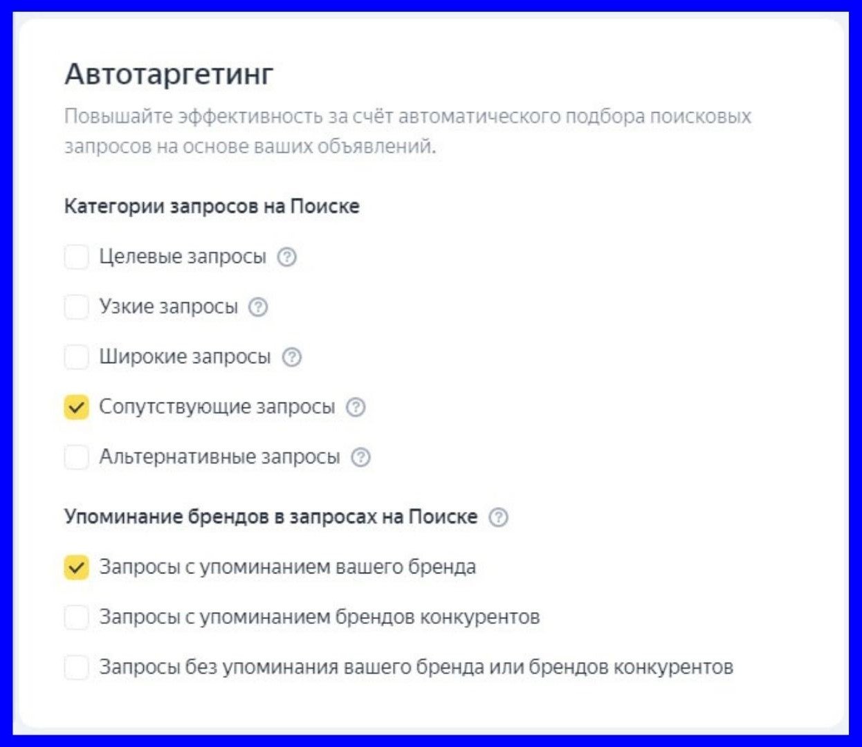 Автотаргетинг также помогает оптимизировать кампанию, выбирая наиболее эффективные ключевые слова и настройки показа объявлений.