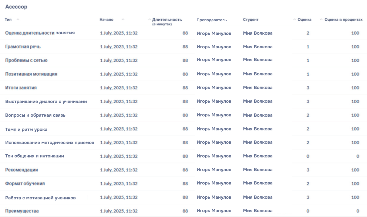 Обычно все эти параметры оценки распределяют между методистом, супервайзером, куратором качества. Но даже при выстроенных процессах человек физически не может уделить каждому уроку столько же внимания, сколько уделяет алгоритм. Подробный анализ одного занятия занимает у специалиста 20–40 минут, тогда как ИИ делает это за секунды и одинаково для всех преподавателей.