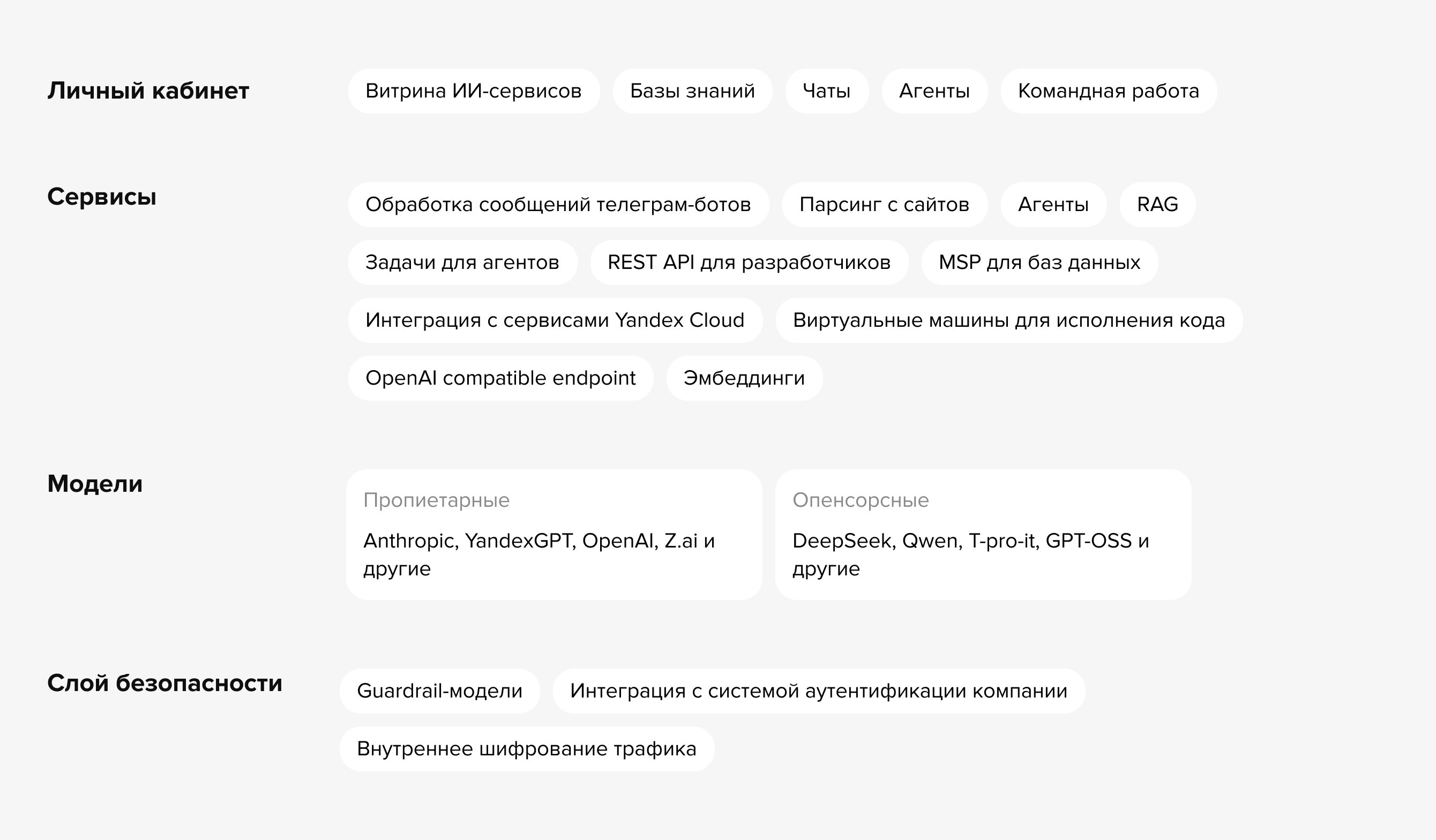 Обычно у крупных компаний есть система, вокруг которой выстроены основные процессы, например учетная платформа вроде 1С и SAP. Сейчас рядом с ней появляется еще один слой — ИИ-платформа. Платформы для внедрения ИИ могут выглядеть по-разному. По нашему опыту, у таких решений есть несколько ключевых компонентов.