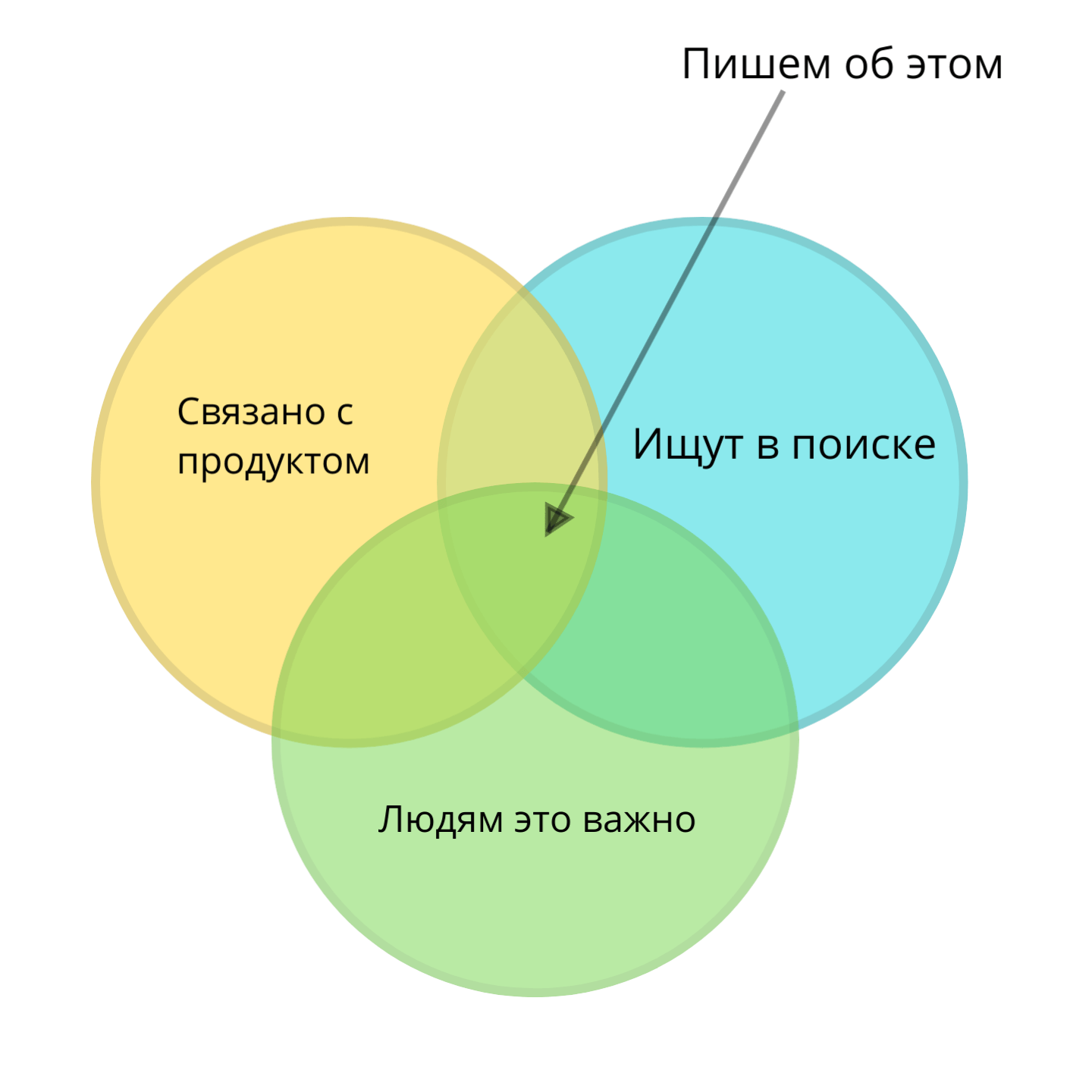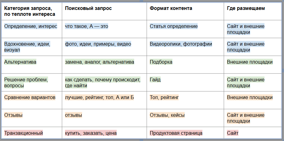 Самые горячие, транзакционные запросы — «купить», «заказать» — ведут на продуктовые страницы вашего сайта. А всё, что холоднее, — поле для блога и внешних площадок.