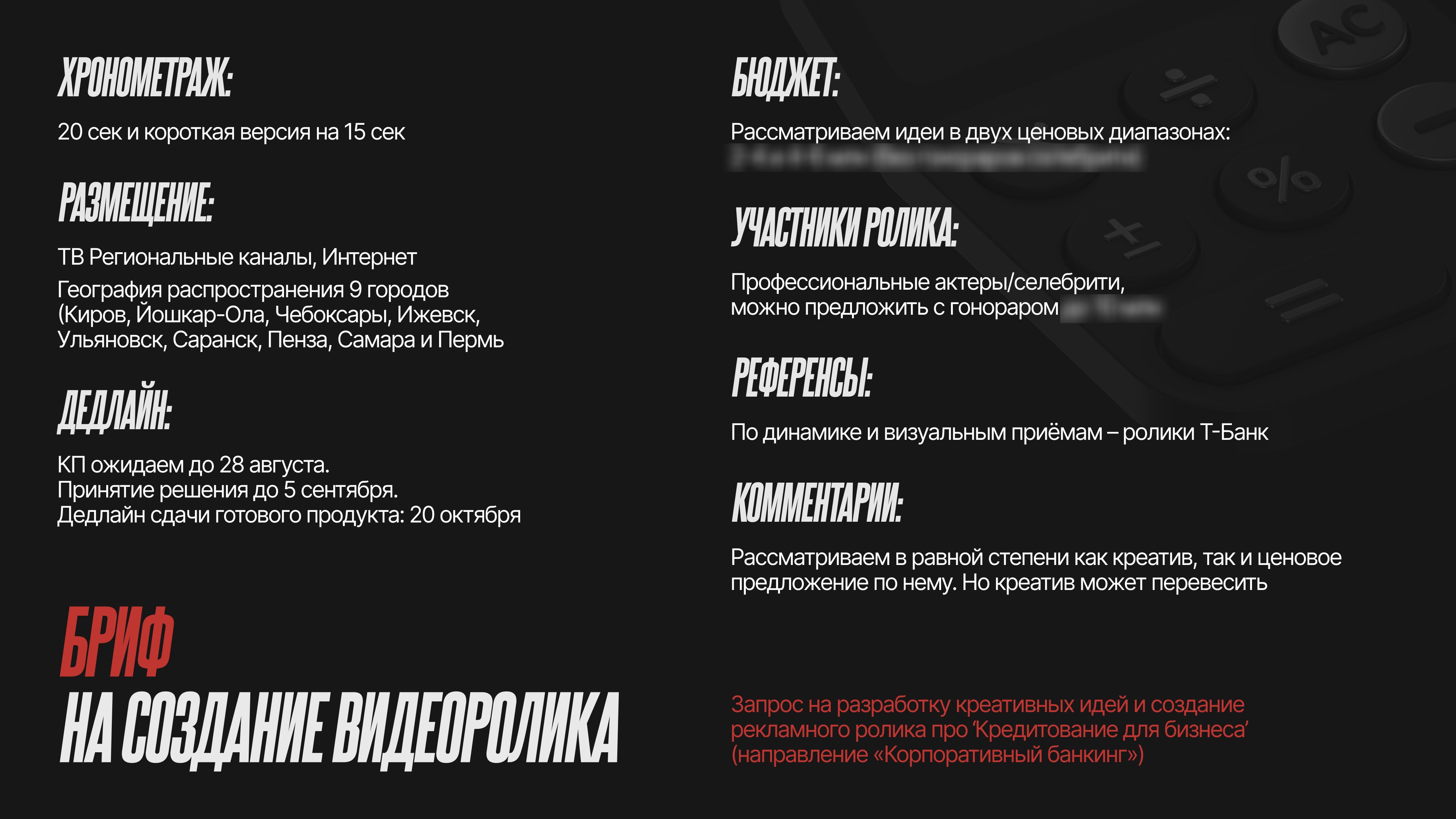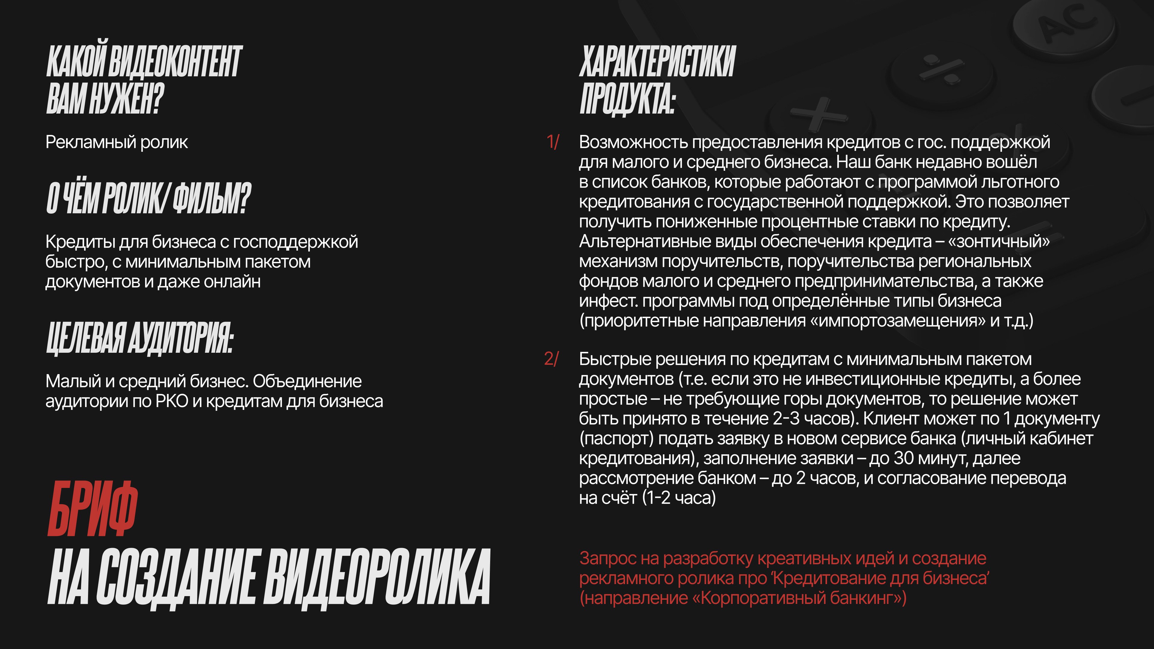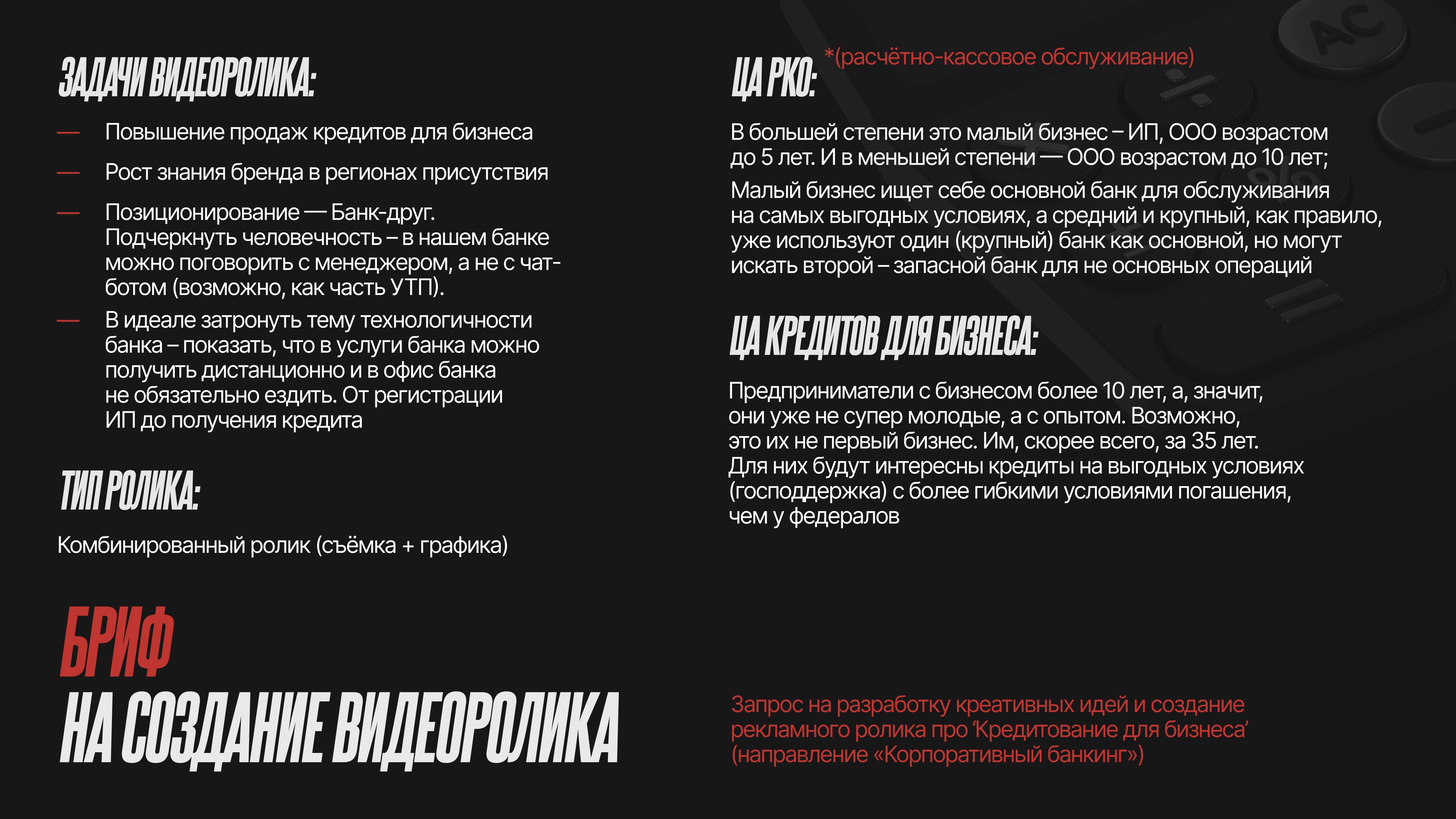 Первый пример — бриф на разработку рекламного ролика для банка.
