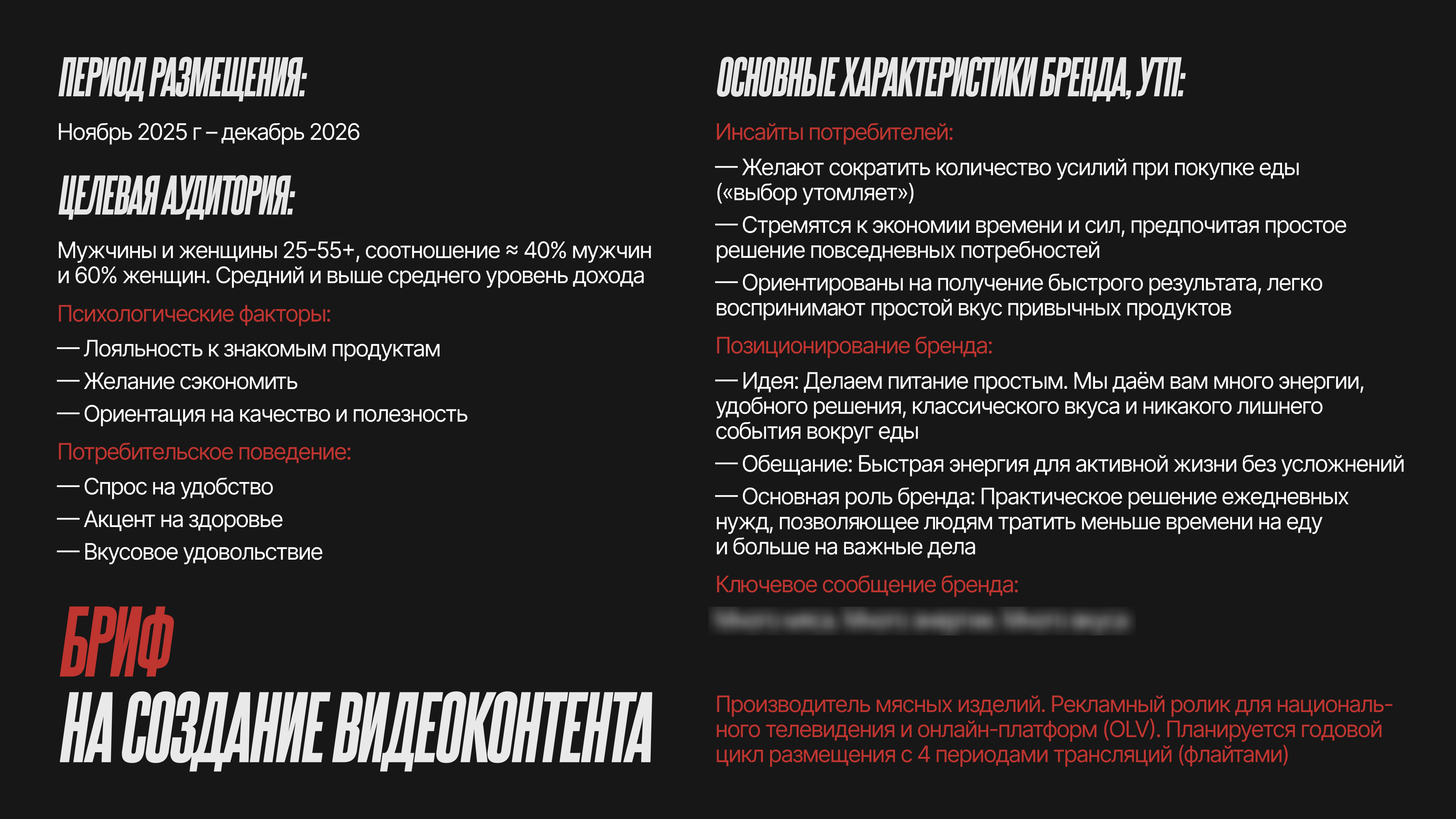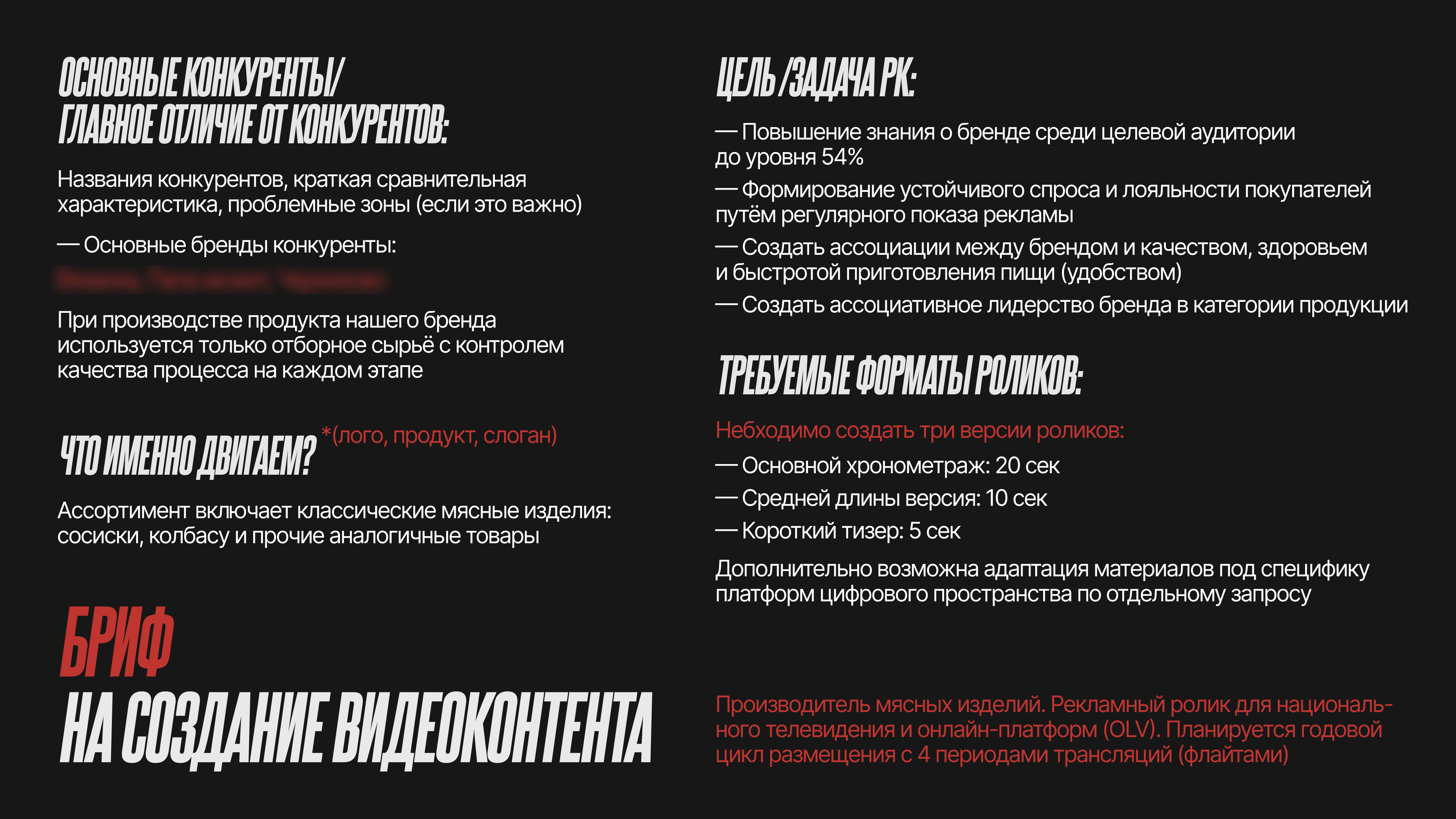 Второй пример — бриф на разработку ролика для производителя мясных изделий.
