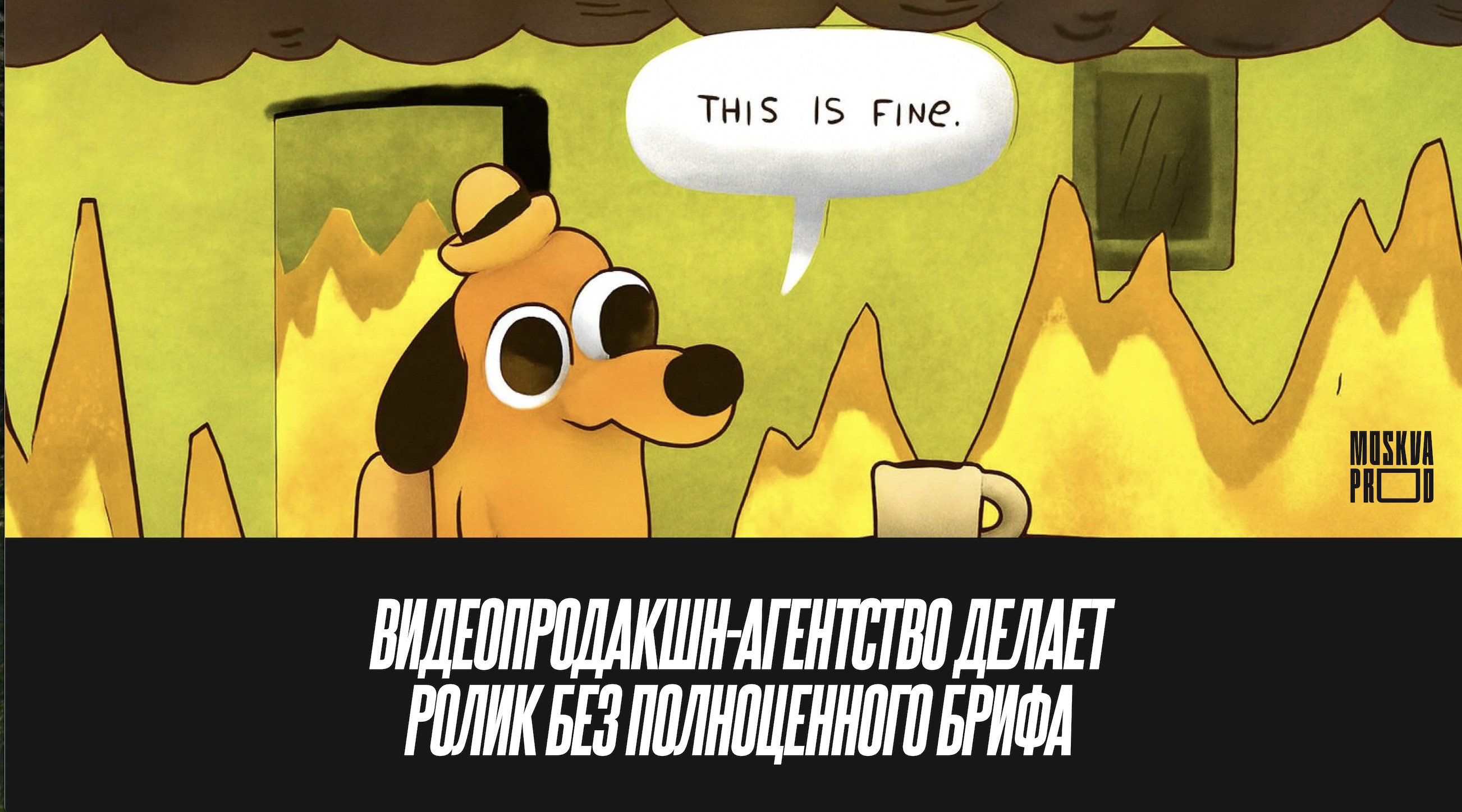 По опыту команды MOSKVA PRODUCTION, из 10 клиентов только 2−3 приходят с полноценно заполненным брифом на видеоролик. Отсутствие брифа означает, что у компании нет понимания по бюджету, по формату, по сроку и другим важным вводным. В ходе проекта, начавшегося таким образом, команды агентства и клиента будут чувствовать себя внутри мема с ошалелой собакой на фоне пожара. И нужного результата, конечно, не будет. Или будет, но не своевременно и с большими перерасходами. Что нужно сделать компании перед заполнением брифа, чтобы создать ролик, согласно ожиданиям руководства, и получить качественный продукт, — разбираемся с Александром Кузиным, коммерческим продюсером MOSKVA PRODUCTION.