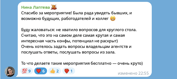 После конференции наше коммьюнити выросло сразу на 200 человек – чат продолжает расти. Там всегда можно попросить совета у коллег и обменяться опытом.