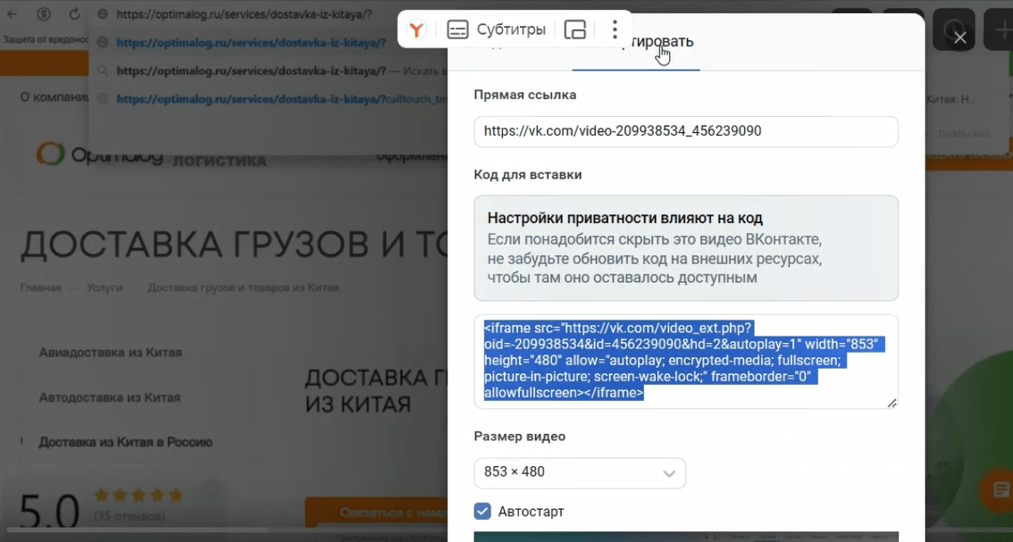 Там появляется iFrame код, который мы можем скопировать. Важно, здесь стоит галочка на автостарте. Лучше её убрать, потому что если оставить, то когда пользователь переходит на эту страницу, видео запустится автоматически.