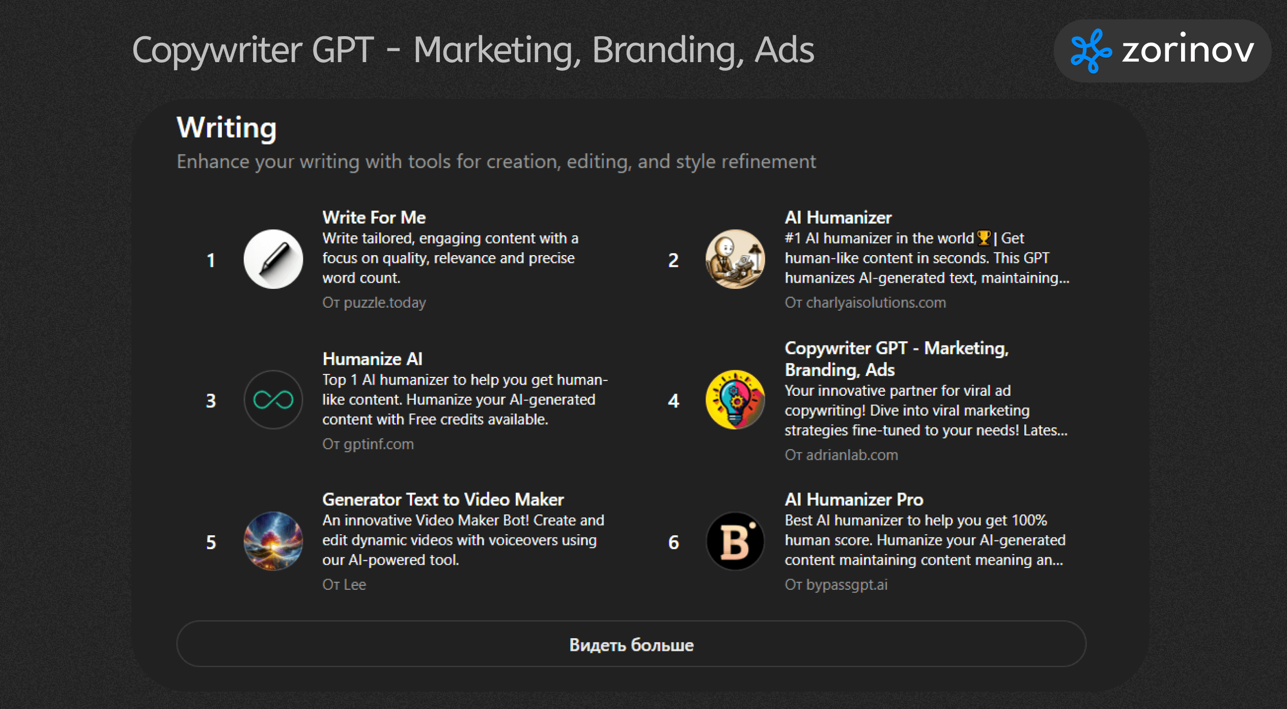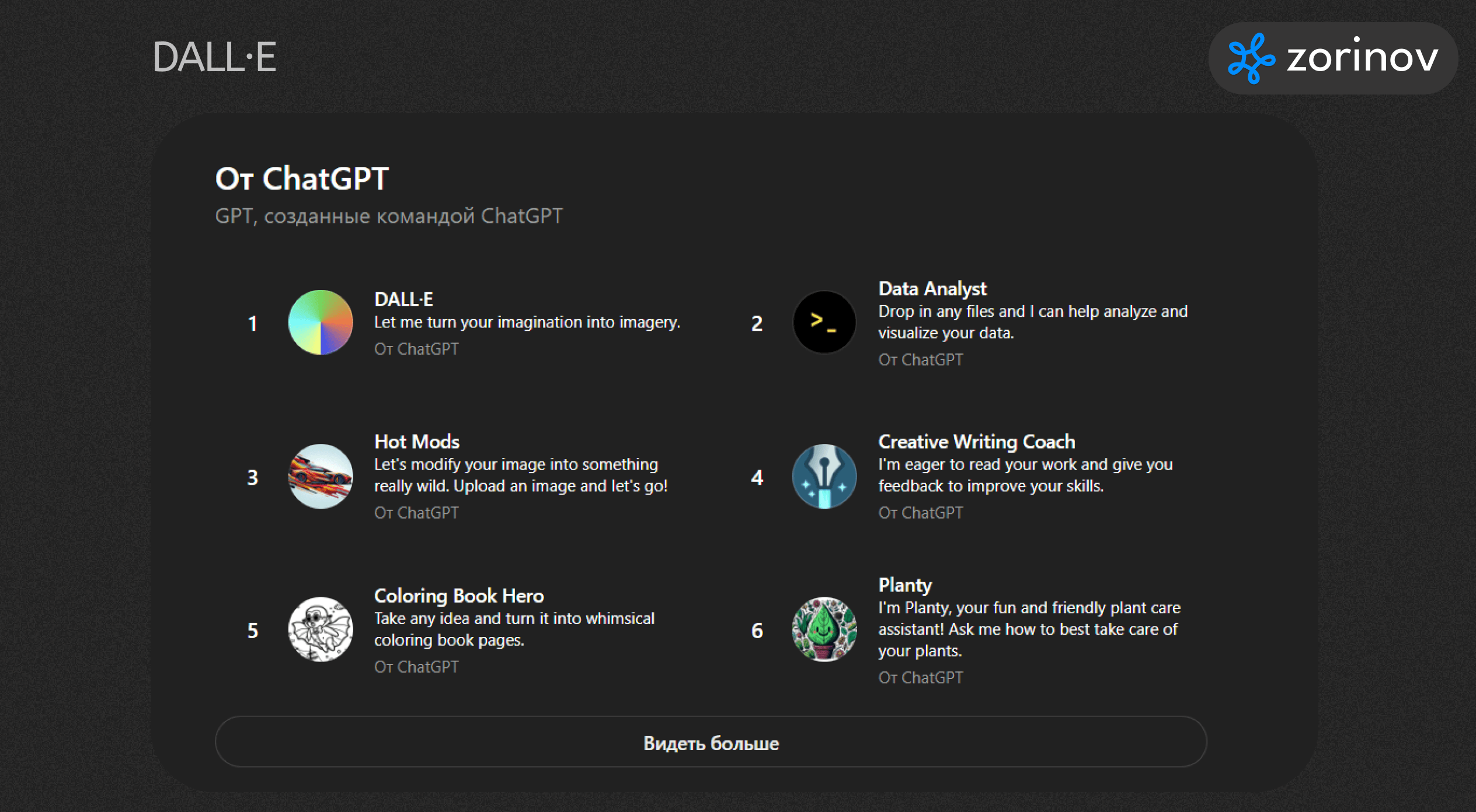 Слева в боковой панели ChatGPT выберите “Обзор GPT” - вам представится множество GPT-агентов для различных задач.