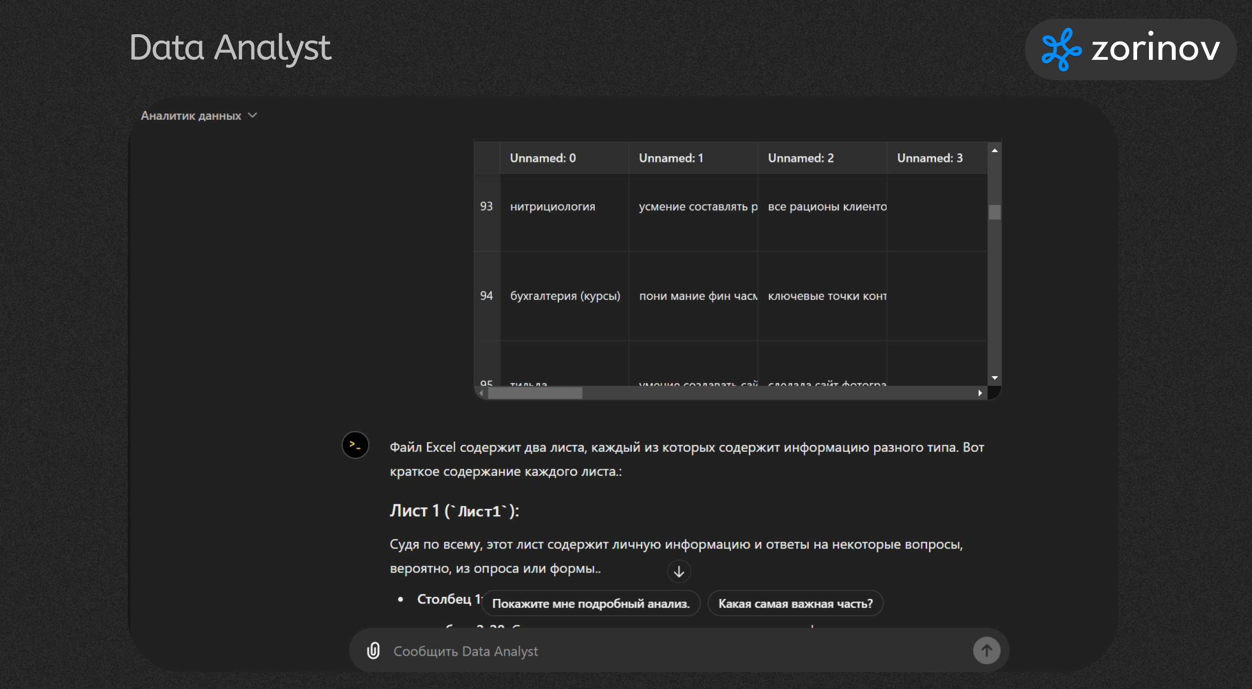 Data Analyst представляет собой специализированный инструмент для обработки, анализа и визуализации данных. Она способна работать с широким спектром файлов и форматов данных, включая CSV, Excel, JSON и текстовые файлы. Пользователь просто присылает данные, а нейросеть автоматически выполняет их предварительную обработку, выявляет ключевые тенденции и закономерности, создает подробные отчеты и наглядные графики.