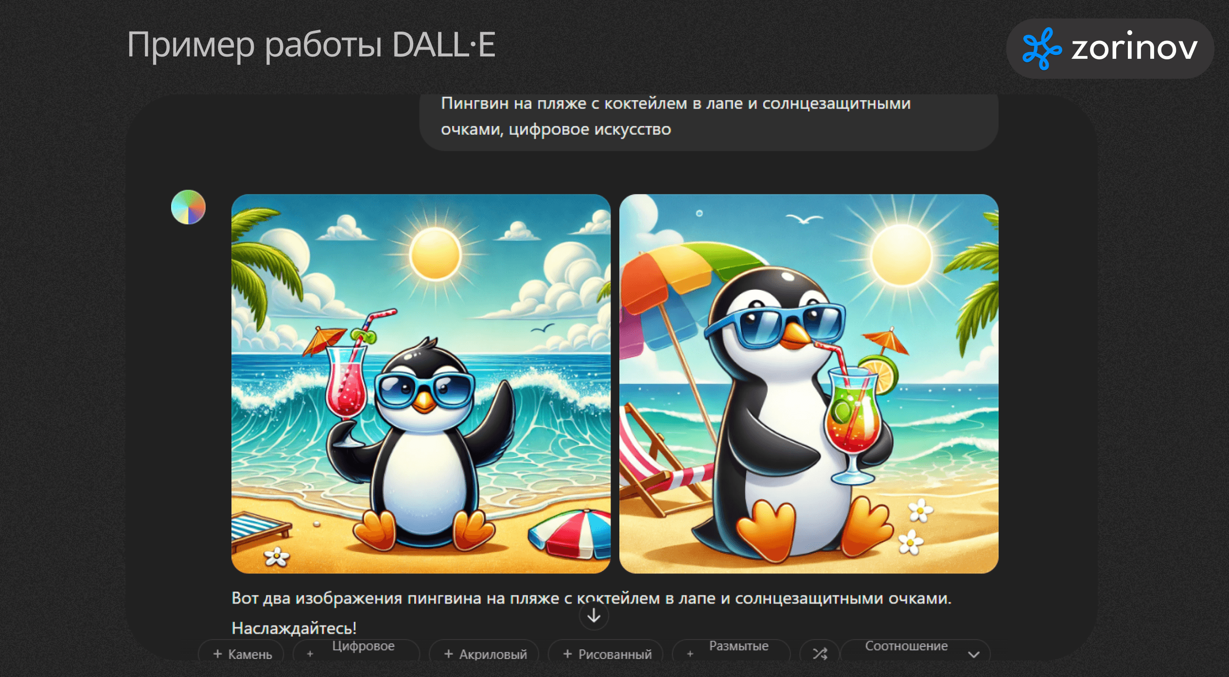 DALL·E представляет собой мощный инструмент для художников, дизайнеров и любых творческих профессионалов, стремящихся воплотить свои идеи в жизнь через искусственный интеллект.