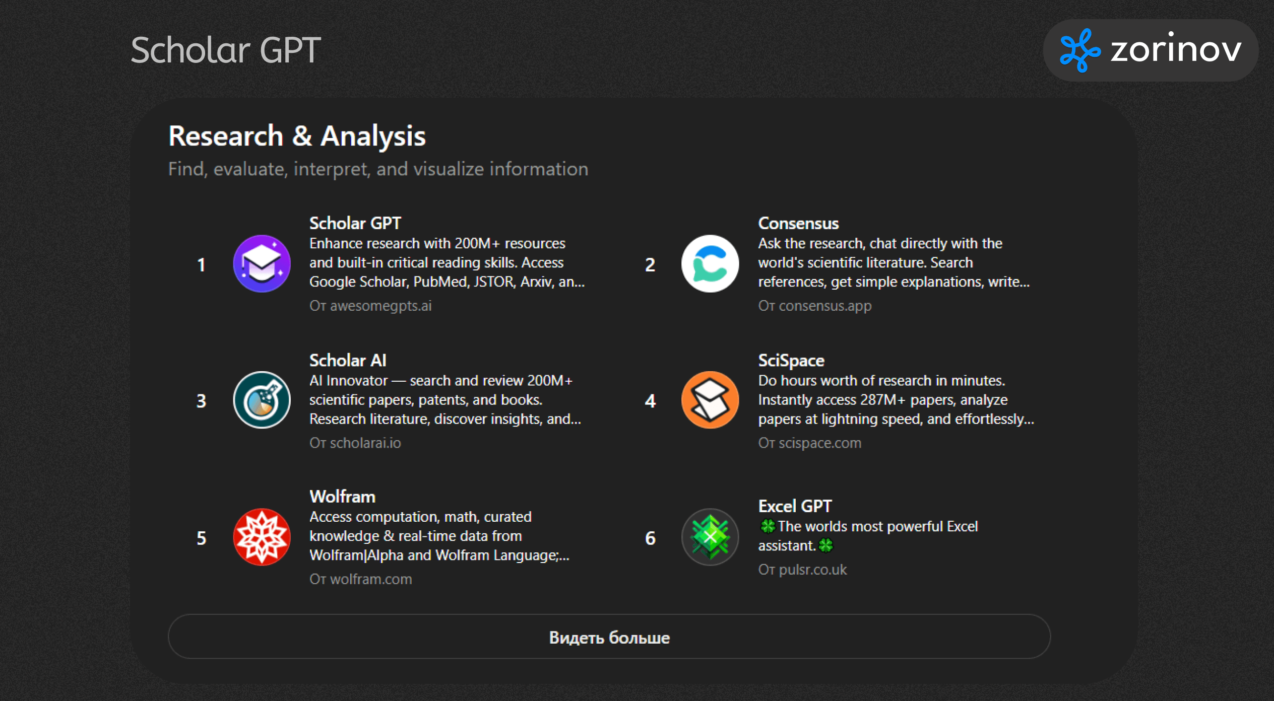 Это продвинутая нейросеть, предназначенная для поддержки научных и академических исследований. Она предоставляет доступ к более чем 200 миллионам ресурсов, включая статьи, исследования и публикации из авторитетных источников. Благодаря встроенным навыкам критического чтения и анализа данных, "Scholar GPT" упрощает процесс поиска нужной информации и её последующую интерпретацию.