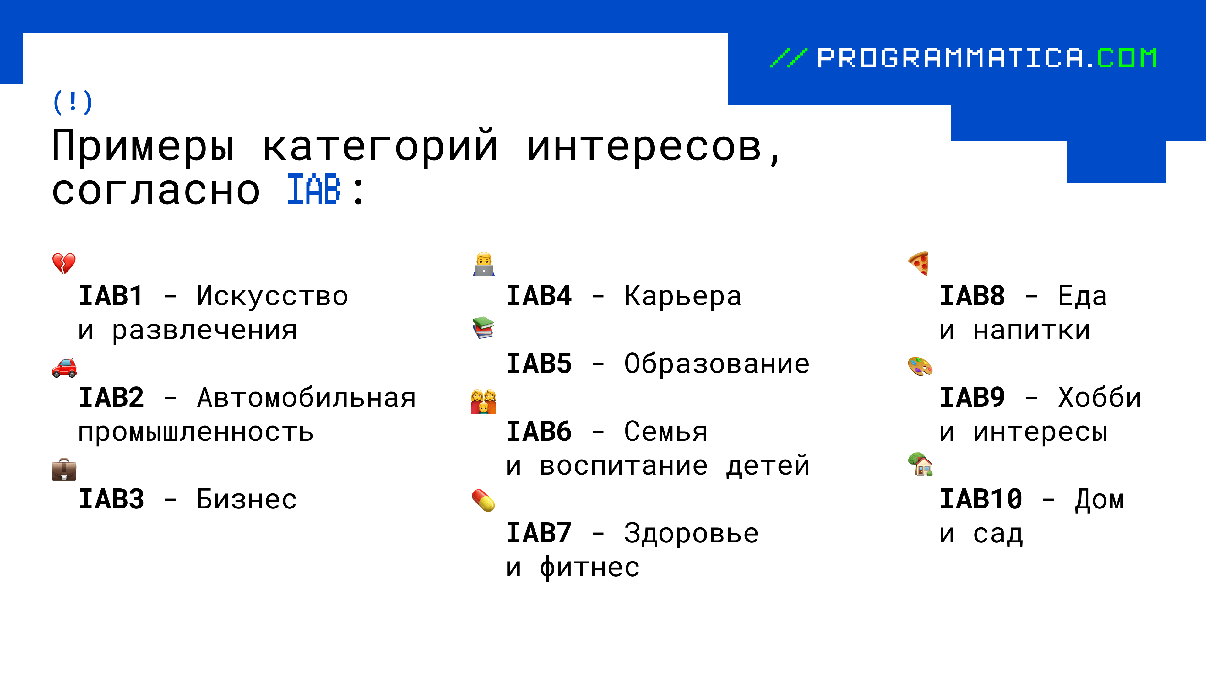 Интересы [IAB-таргетинг] Таргетинг по интересам — это показ рекламы пользователям, проявляющим внимание к определённым темам, или категориям контента. Чтобы структурировать такие интересы и обеспечить единый подход к сегментации аудиторий, была разработана система классификации на основе стандартов IAB (Interactive Advertising Bureau). По сути, это независимый судья, который помогает отнести пользователя к одной из категорий интересов.