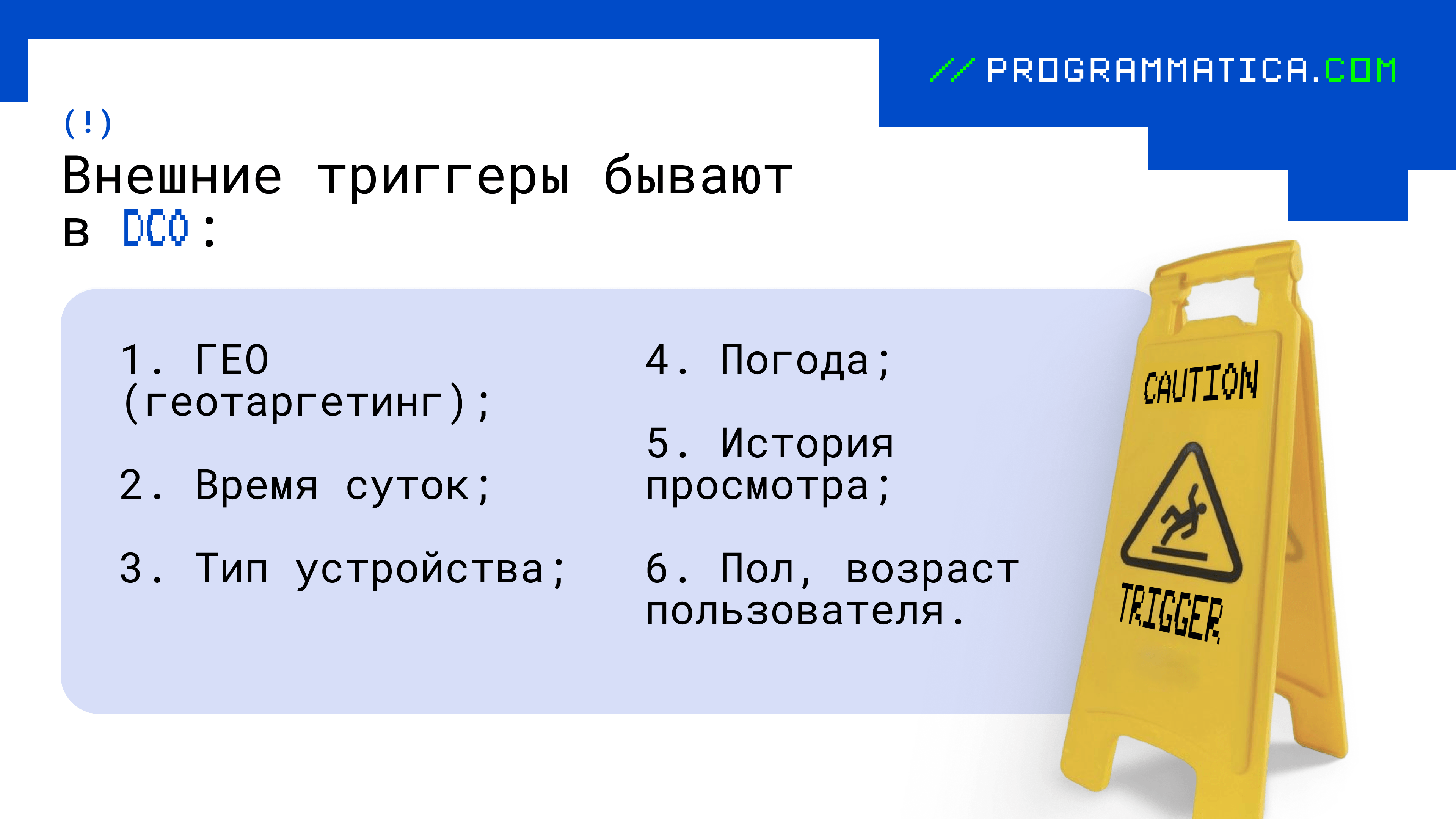 Технология, позволяющая адаптировать рекламное объявление в режиме реального времени в зависимости от внешних условий (триггеров). Такие изменения позволяют формировать персонализированные креативы, которые максимально соответствуют текущему контексту и интересам конкретного пользователя. Какие элементы креатива можно менять: 1. Текст на креативе; 2. Графические элементы (картинки / фон); 3. Кнопки призывающие совершить действие (CTA).