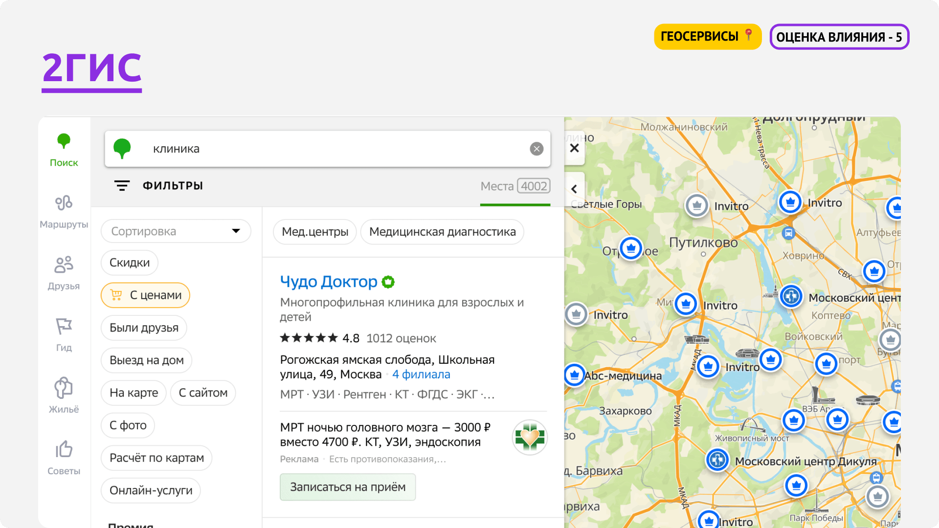 Геосервис, который активно используют при выборе офлайн-услуг, в том числе медицинских. Пациенты обращают внимание на отзывы, актуальность информации и визуал карточки.