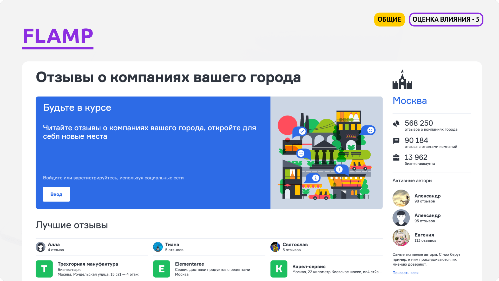 Flamp — это один из крупнейших отзовиков в России, созданный компанией 2ГИС. Ежемесячная аудитория площадки превышает 8 млн пользователей. Профиль клиники на Flamp помогает повысить доверие пациентов и улучшить видимость бренда в поисковой выдаче Яндекса и Google.