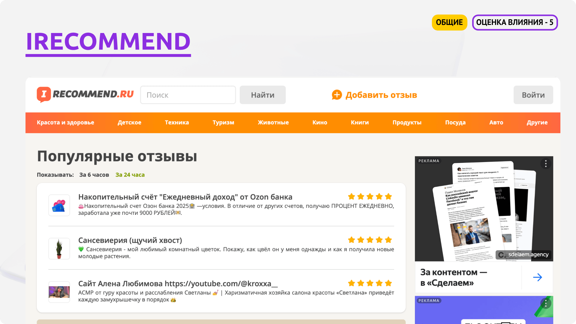 IRecommend.ru — крупная площадка пользовательских отзывов в Рунете, ежемесячно на сайт осуществляется 33 млн визитов. Длинные развернутые отзывы про услуги и сервис хорошо ранжируются и часто попадают в выдачу по брендовым запросам, формируя первое впечатление о медцентре (на платформе есть отзывы и о клиниках).