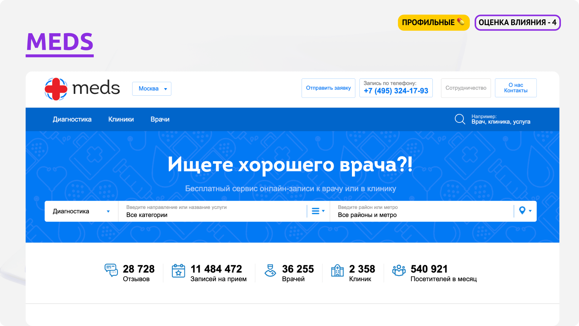 Meds.ru — медицинский сервис с каталогом врачей, клиник и диагностических центров, где пациент выбирает специалиста по цене, рейтингу, опыту и ближайшей доступности и сразу записывается онлайн. В базе Meds.ru больше 500 частных клиник и диагностических центров, 2000 частных врачей.