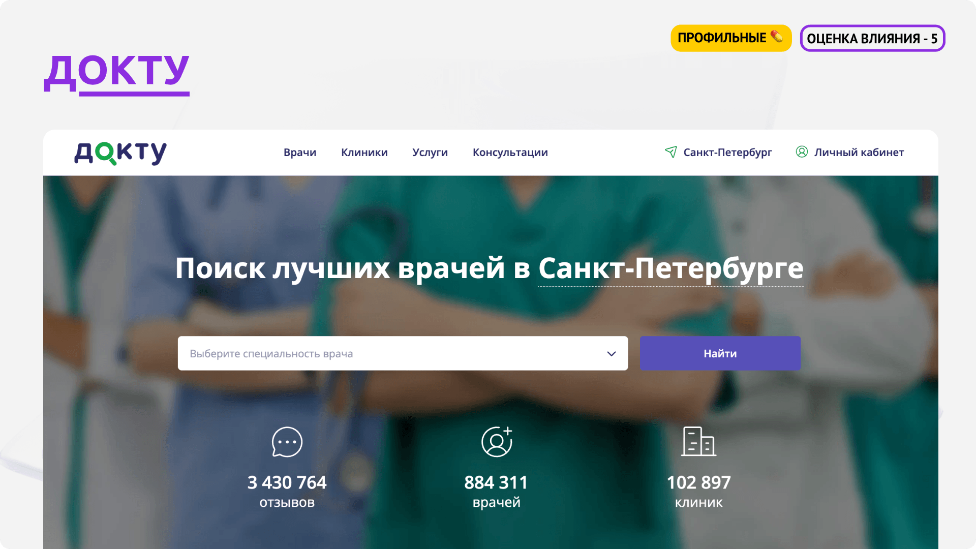 Doctu.ru — это профильный медицинский портал, который ежемесячно посещают более 3 млн пользователей. Здесь пациенты ищут врачей и клиники, сравнивают цены, читают реальные отзывы и сразу записываются на прием. Для клиник это возможность повысить доверие и привлечь пациентов за счет прозрачных рейтингов и удобной онлайн-записи.