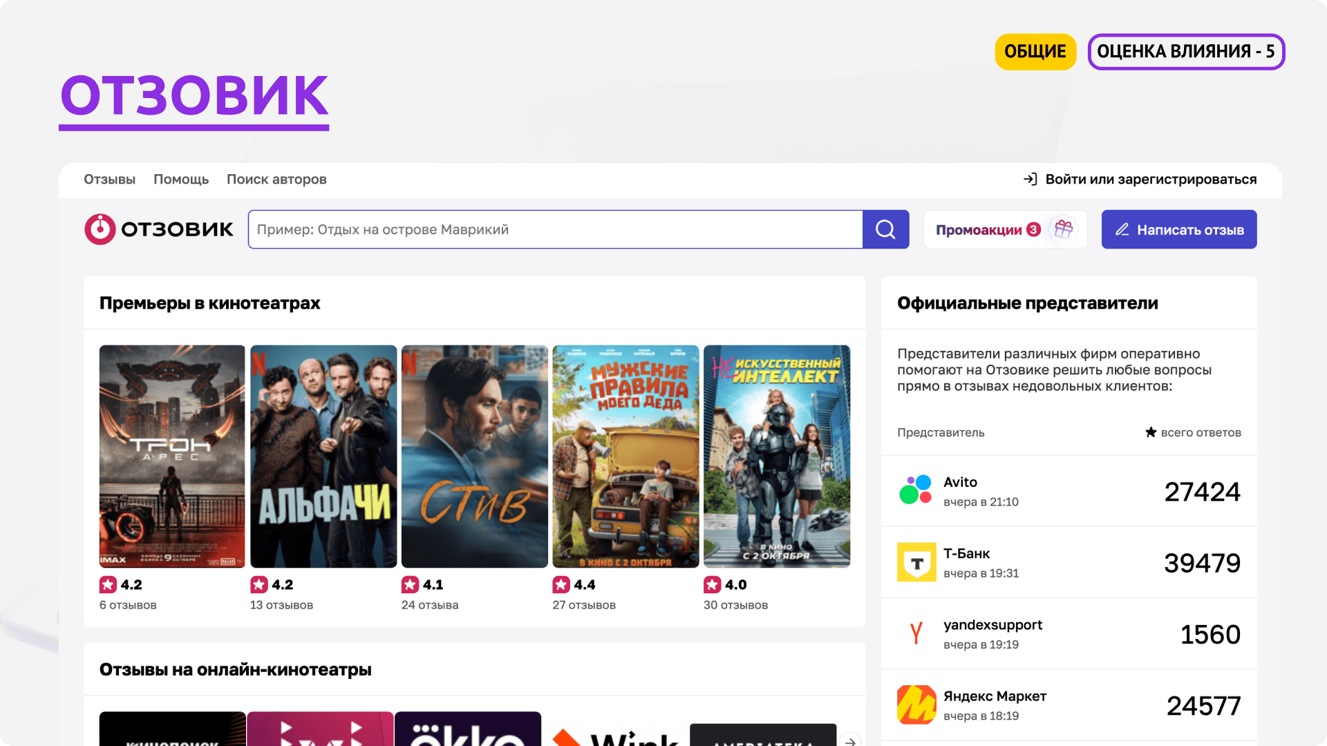 Otzovik — крупнейшая независимая платформа отзывов в России. Площадка насчитывает более 10 млн уникальных посетителей в месяц и активно индексируется поисковыми системами, поэтому отзывы часто попадают в ТОП-10 Google и Яндекс. Отзывы здесь влияют не только на пациентов, но и на поисковики: положительные публикации усиливают репутацию бренда и увеличивают видимость в поиске.