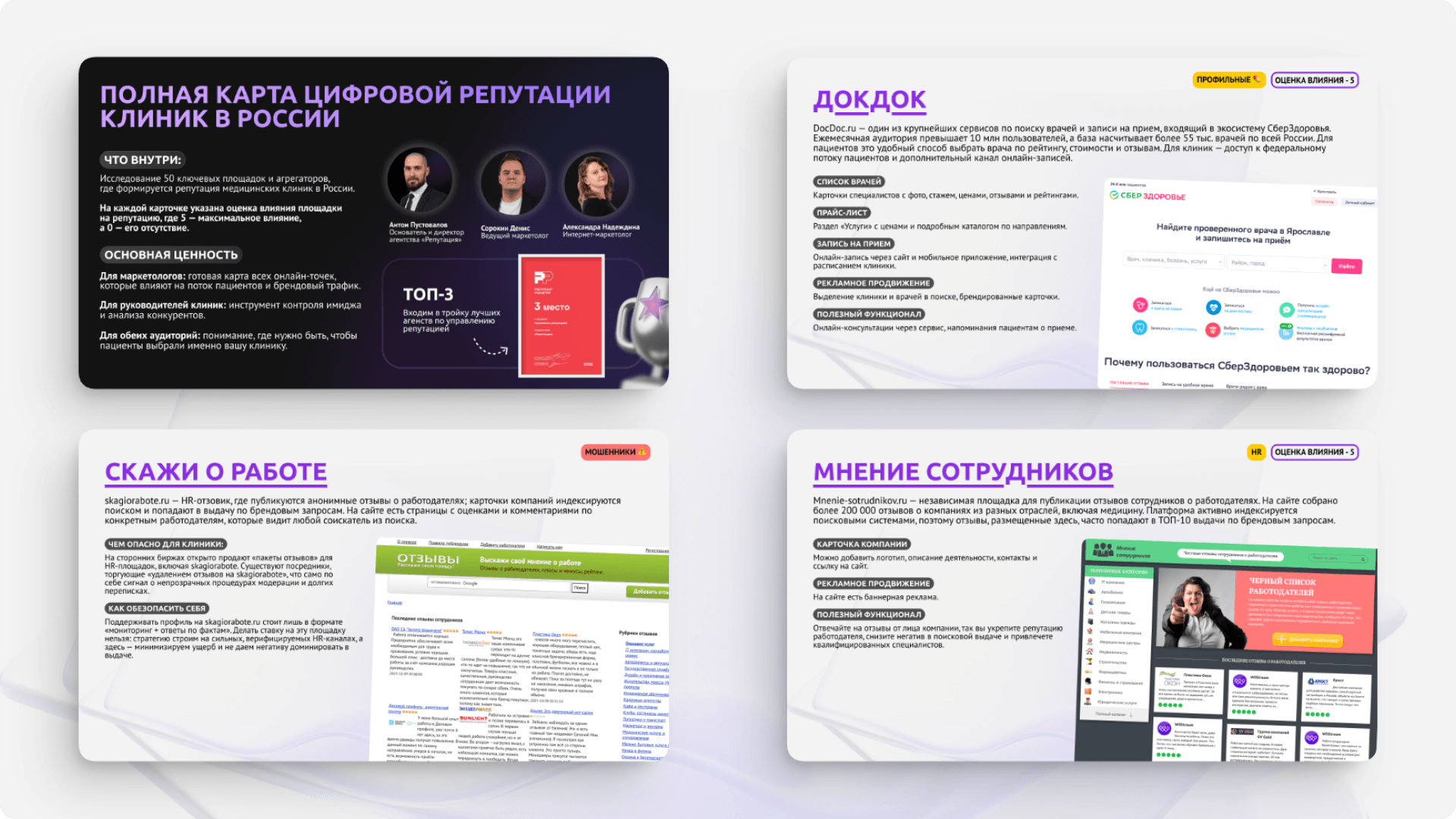 В итоге для обеих аудиторий материал решает одну задачу — показывает, где именно нужно быть представленным и управлять репутацией, чтобы пациенты выбирали вашу клинику, а не соседнюю.
