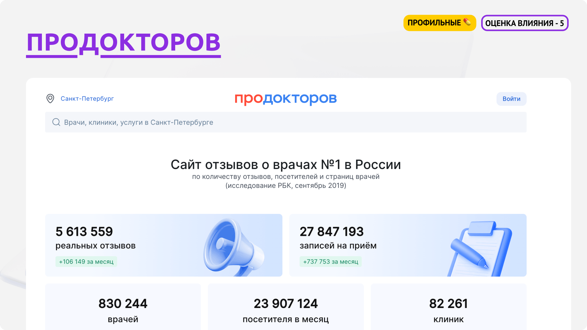 ProDoctorov.ru — крупнейшая медицинская платформа в России с аудиторией более 9 млн пользователей в месяц. Это самый известный ресурс с проверенными отзывами о врачах и клиниках: здесь каждый отзыв проходит модерацию, а удалить их крайне сложно. ProDoctorov — это главный инструмент управления репутацией для клиник и один из основных каналов привлечения новых пациентов.