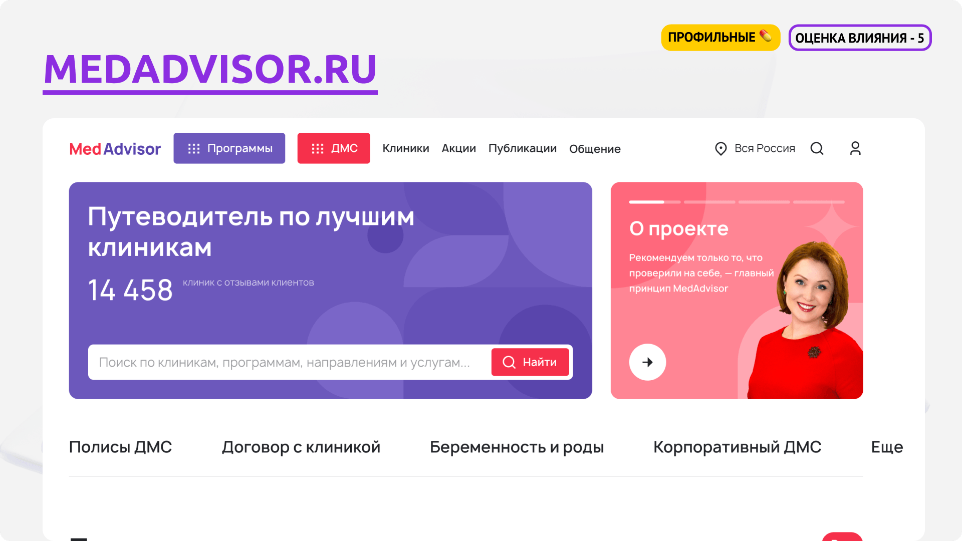 MedAdvisor.ru — путеводитель по лучшим медицинским клиникам. Ежемесячная аудитория площадки — около 500 тыс. пользователей, которые ищут медицинские услуги, читают отзывы и сравнивают цены.